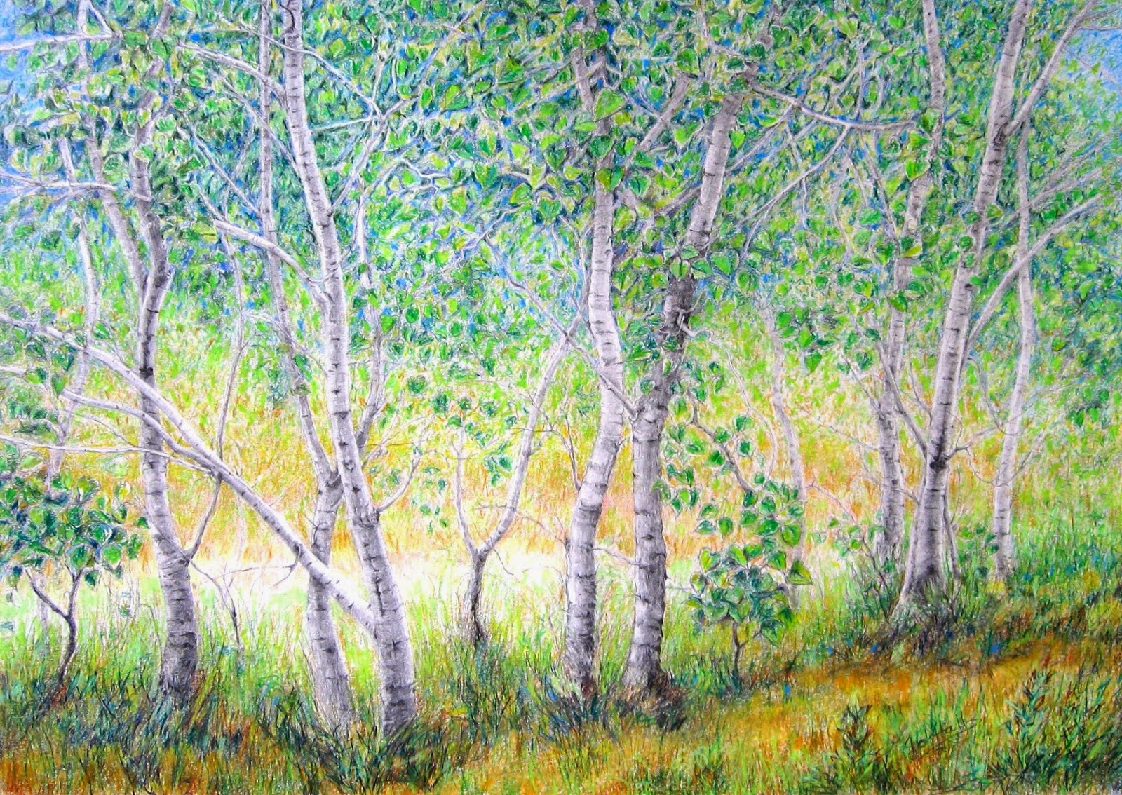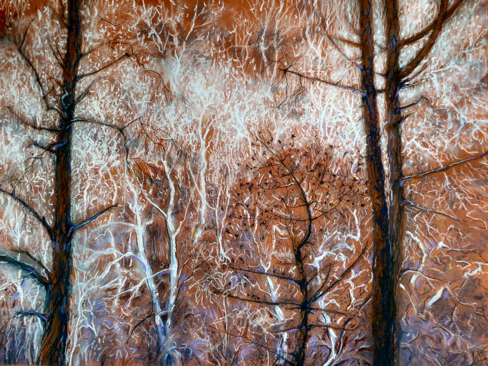 Trees are some of the most fascinating of life forms, and drawing media are perhaps the best way to reflect their linear growth and rhythm of movement. Sometimes the life of the forest is halted abruptly as in the forest fires of 2011 in Madeira. Only a year later, when I visited in January 2012, the undergrowth and shrubs were beginning to recover but the Eucalyptus and pine trees were an eerie, almost monochrome tapestry against the terracotta rocks. The sight is still fresh in my memory.