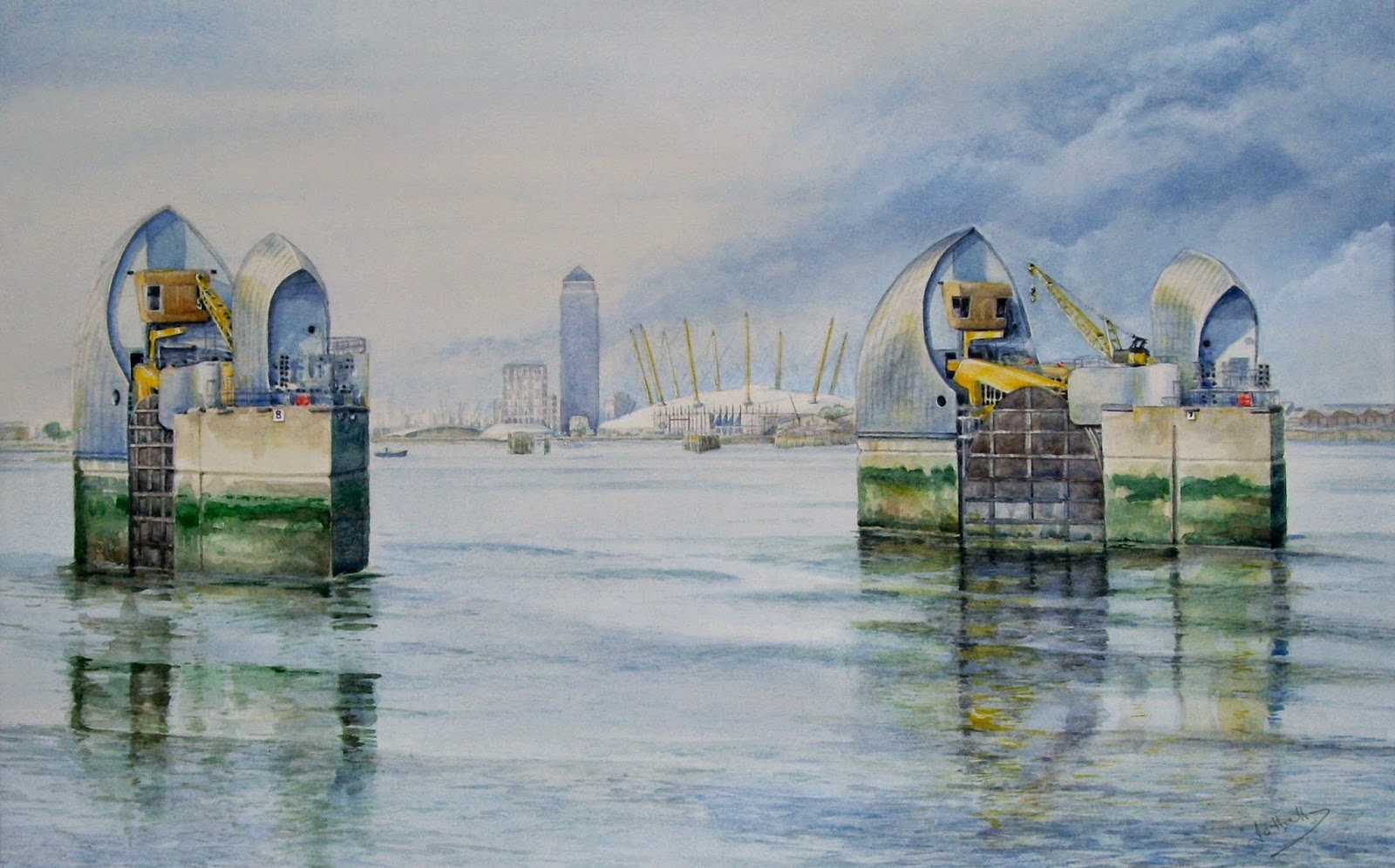The watercolour above, completed in 2001, is now a historic record of the Thames and architecture from the South Bank looking toward Blackfriars Bridge and St. Paul’s Cathedral. Tower 42 is on the far right. This painting, and the work below of the Thames Barrier with Canary Wharf and the Dome beyond, dating from the same year, will be on show at Jo’s studio for the forthcoming Cookham and Maidenhead Arts Trail on 27th and 28th September together with recent works. Details of all the venues and participating artists can be found at www.camat.org.uk