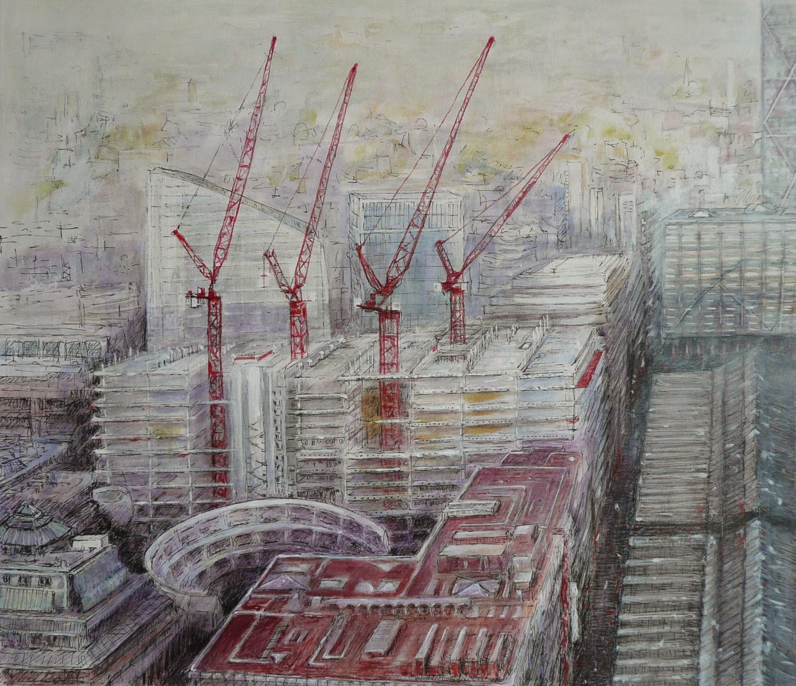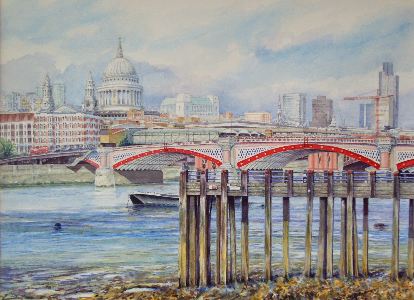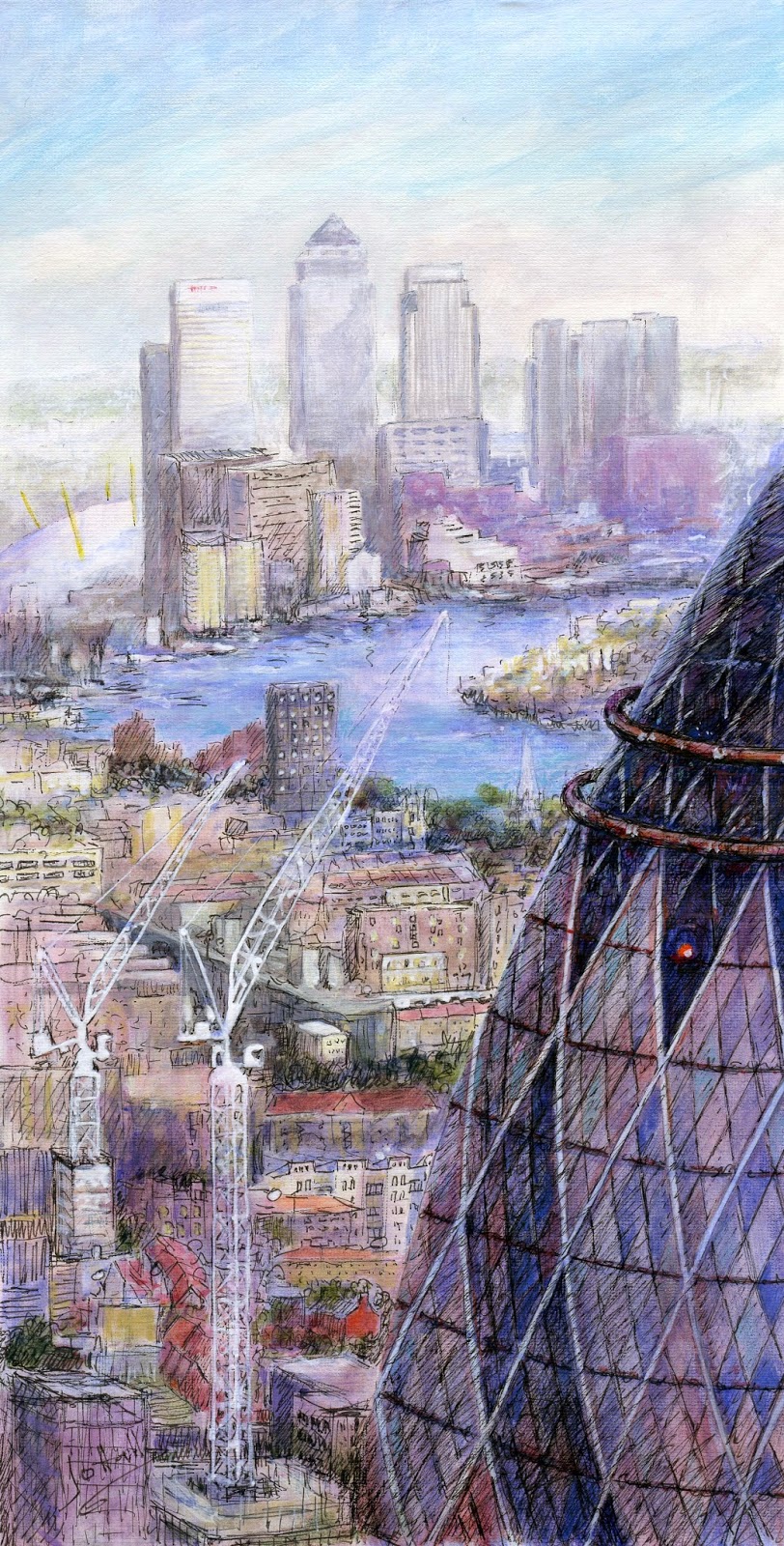 Having lived all my life near the Thames, in London, as a child, and now much further upstream where life is a little more rural I still take every opportunity to draw in London, fascinated by the constant changes wrought by demolition and construction. My contributions to the Exhibition are below.