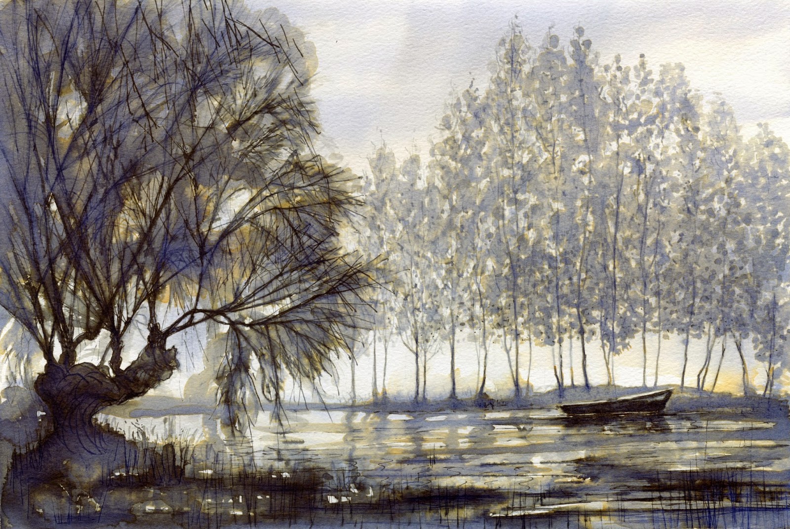 Black ‘Quink’ fountain pen ink was applied to the paper with a pen and also diluted and washed with a brush. The wet ink separates into its component dyes as each moves at a different rate on the damp paper, producing beautiful tints of amber and blue in places. Sadly such dye based inks are fugitive when exposed to light, so works produced in this way must be kept in reduced light conditions or reproduced as prints with light fast inks.