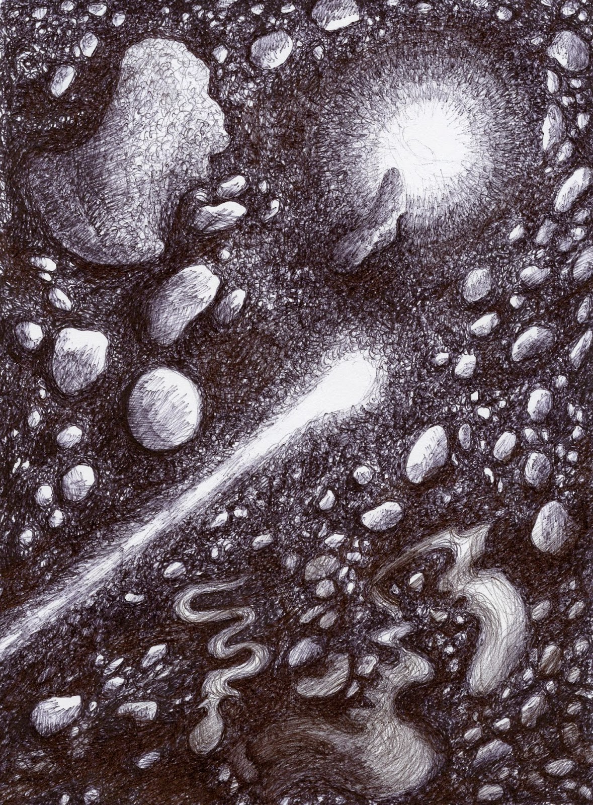 I have just been drawing asteroids with a ball point pen, after the Horizon programme featuring the dangers of small asteroids to our planet, shown again on Thursday 12th February. This was of special interest as the Society of Graphic Fine Art’s optional theme for its 94th Open Annual Exhibition at the Menier Gallery in Southwark, London is ‘Time and Space’. I’m still thinking about the time part!