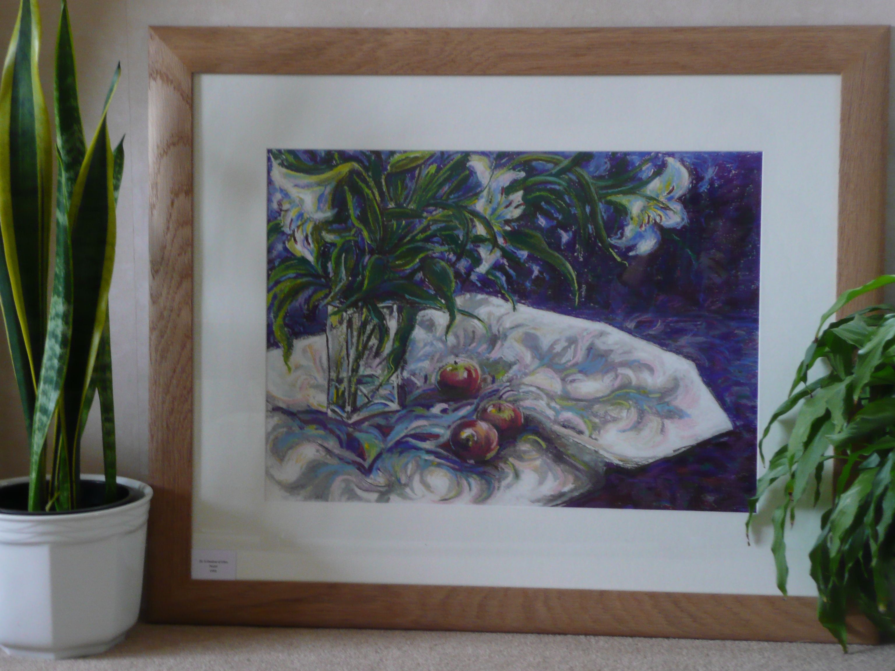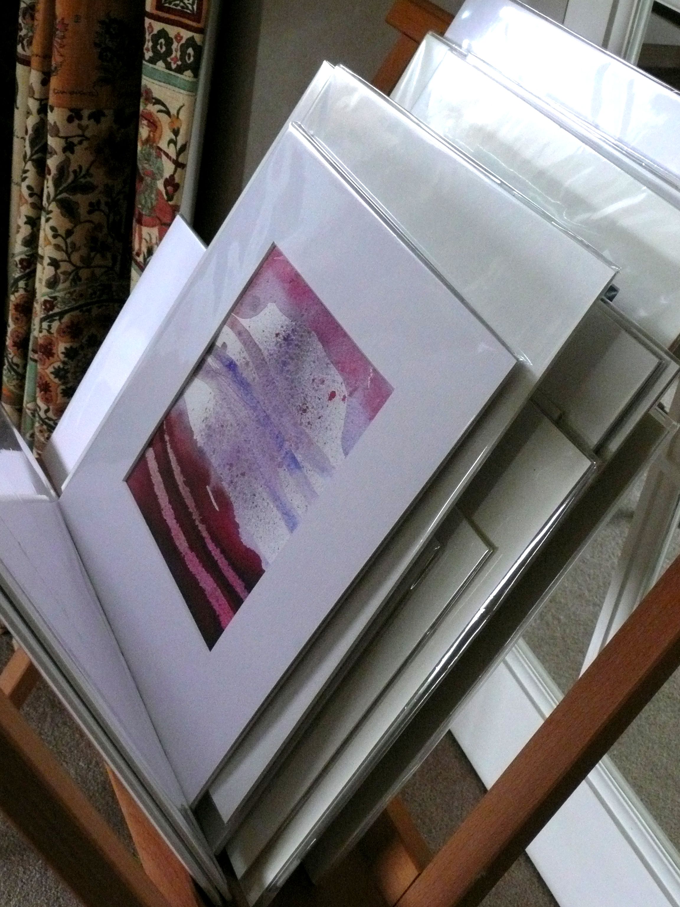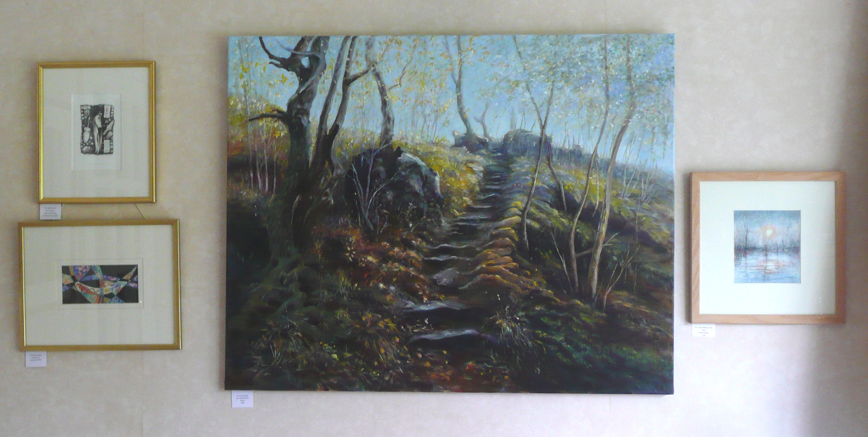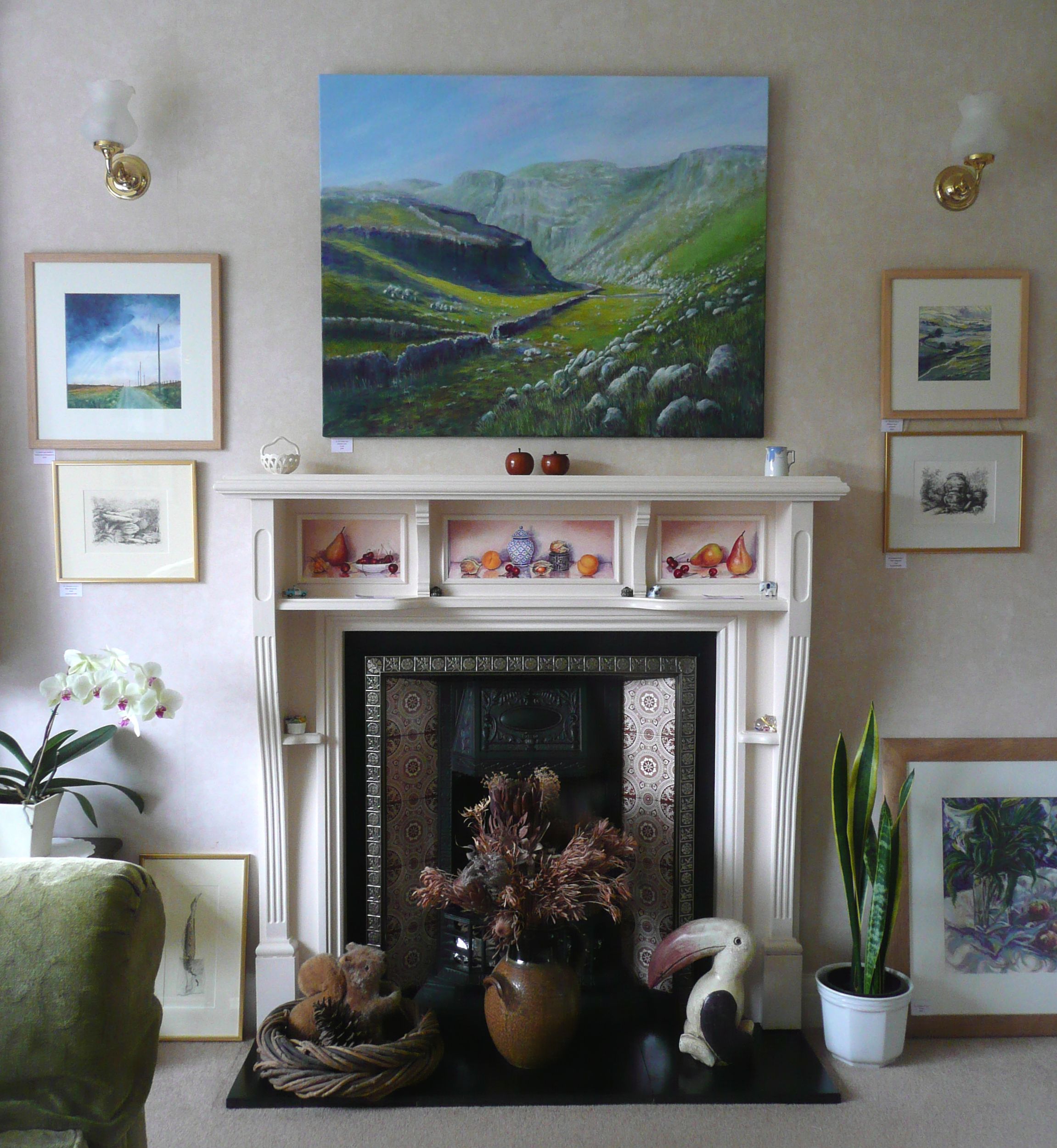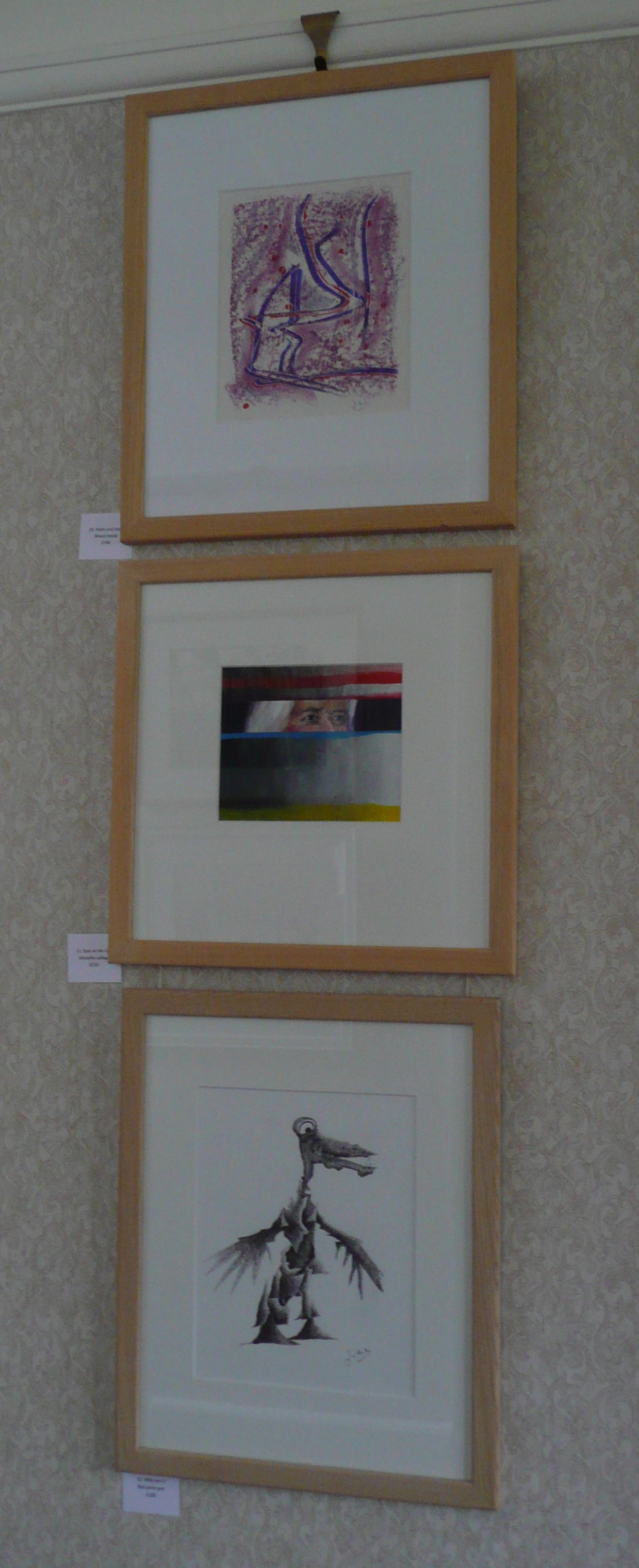 Part of the fun or challenge was hanging the works in a non-gallery space.  My studio is not suitable so I use the living space of my home.  The constraints of hanging works in a gallery are mainly the wall space and configuration, and lighting, but by and large one is arranging works with regard to how they impact on each other.  The walls are usually white and furniture is minimal.  At home one has the colour of furniture, curtains and carpets competing for attention with the art work.