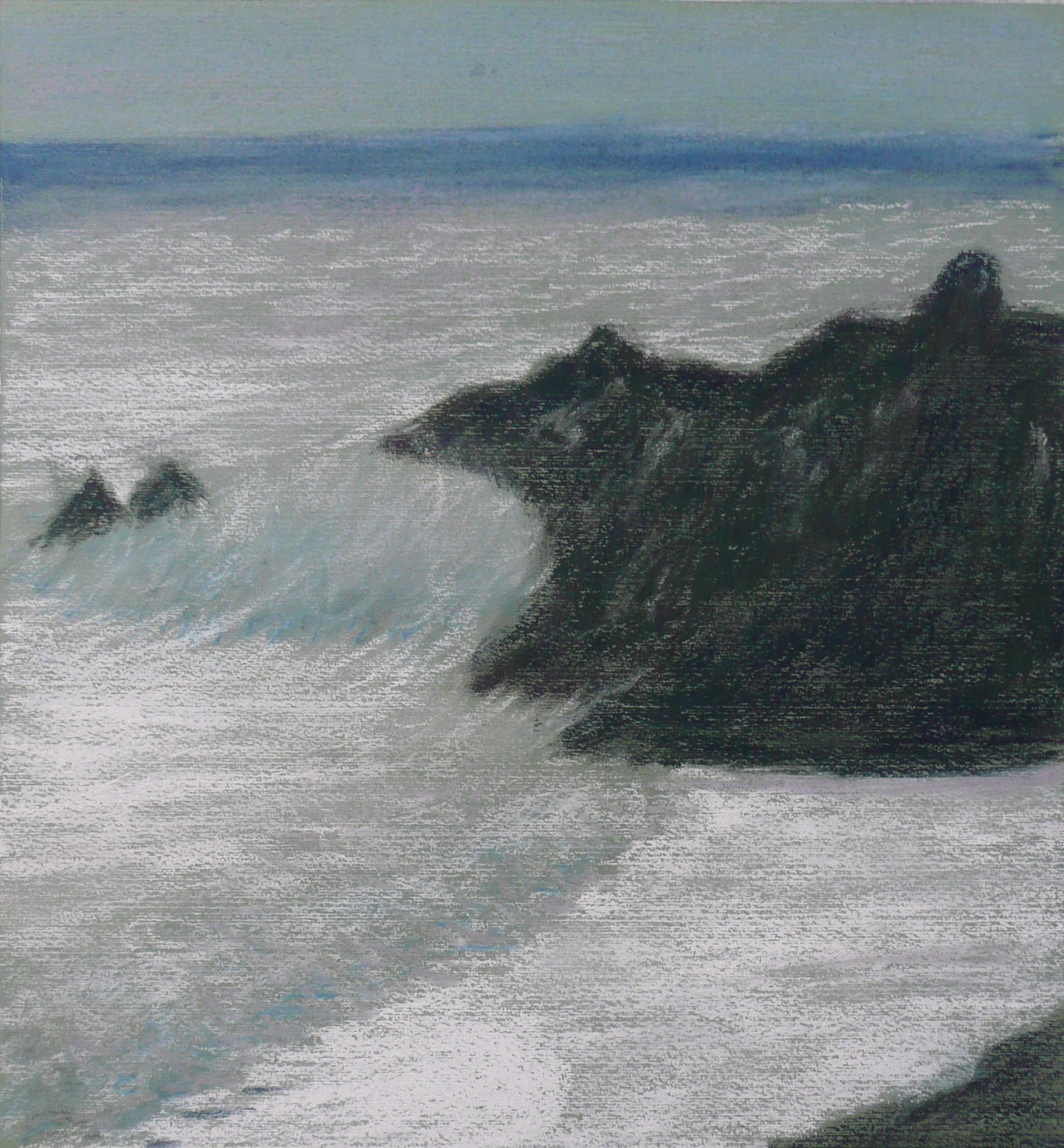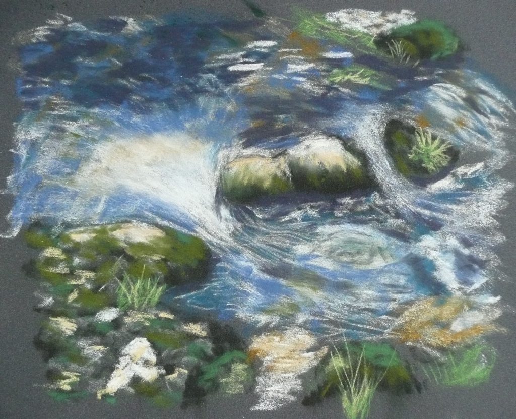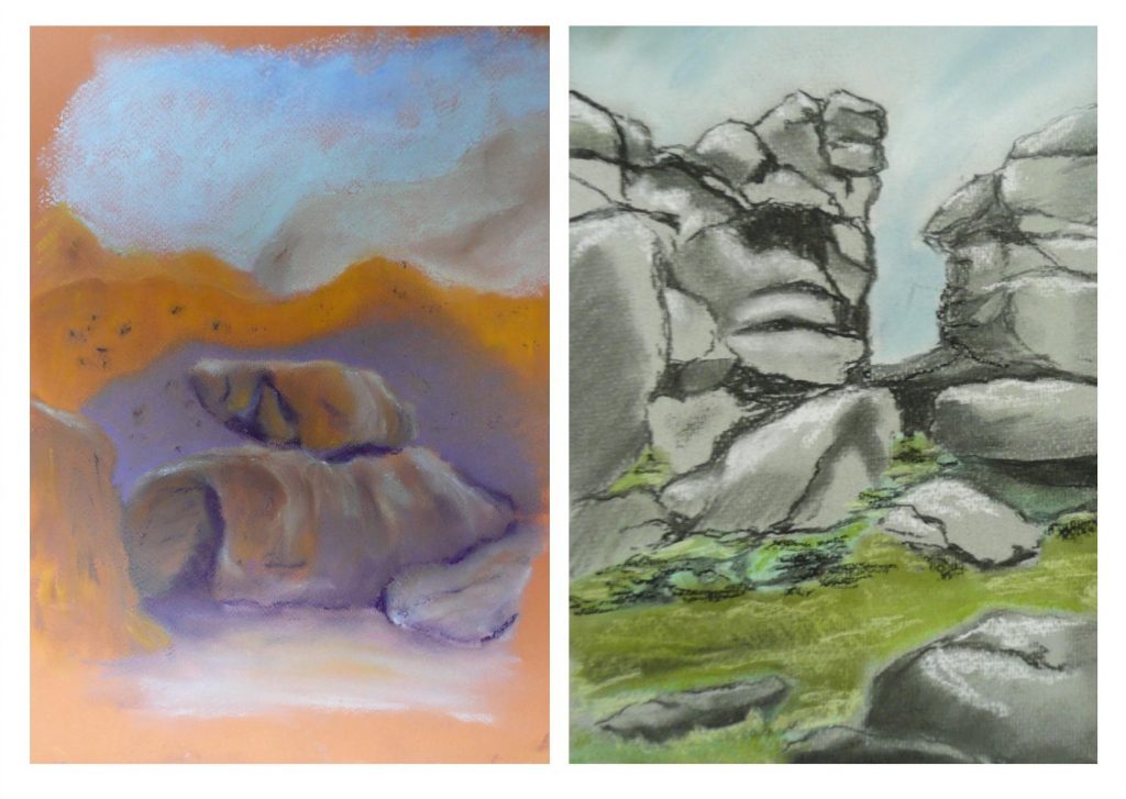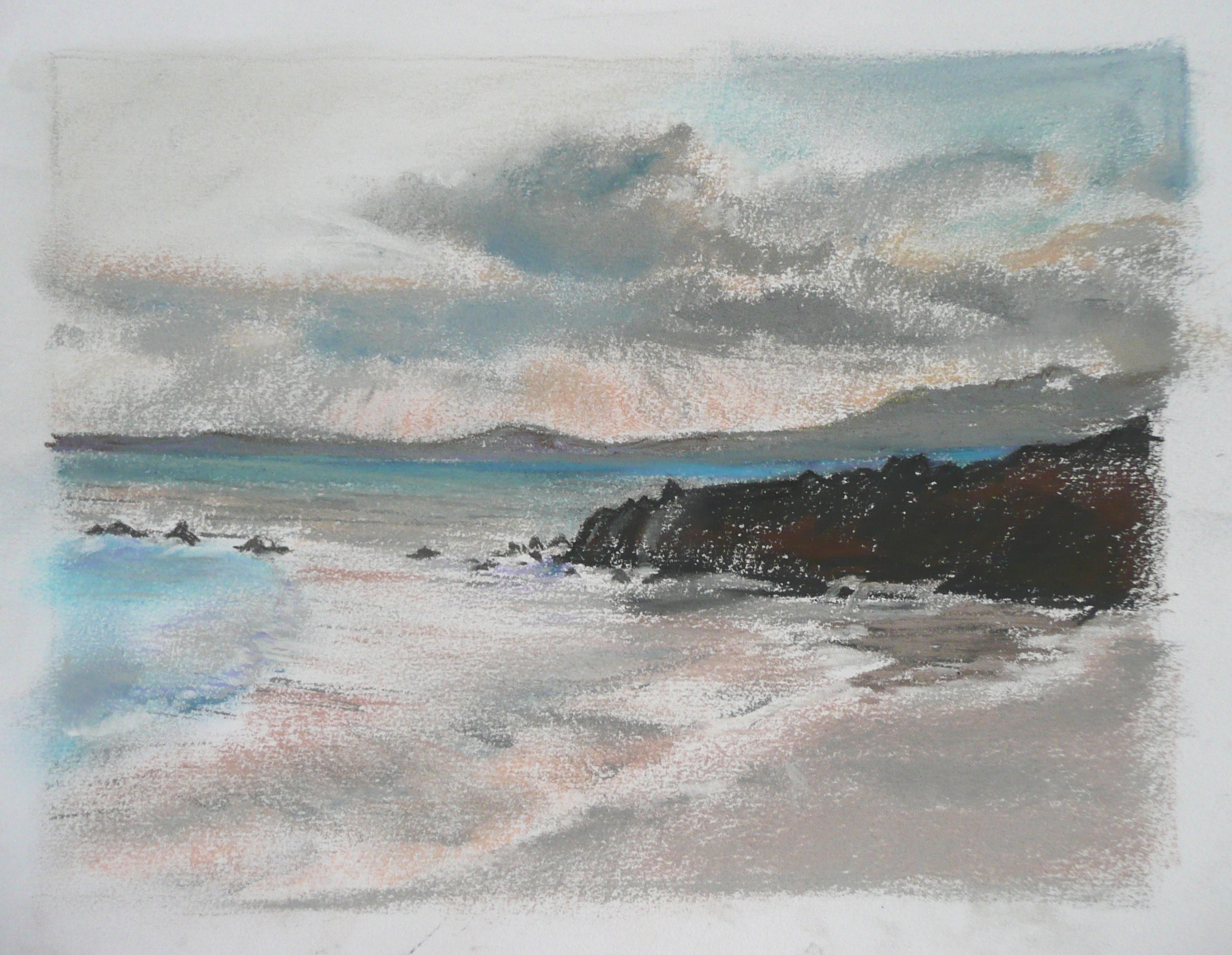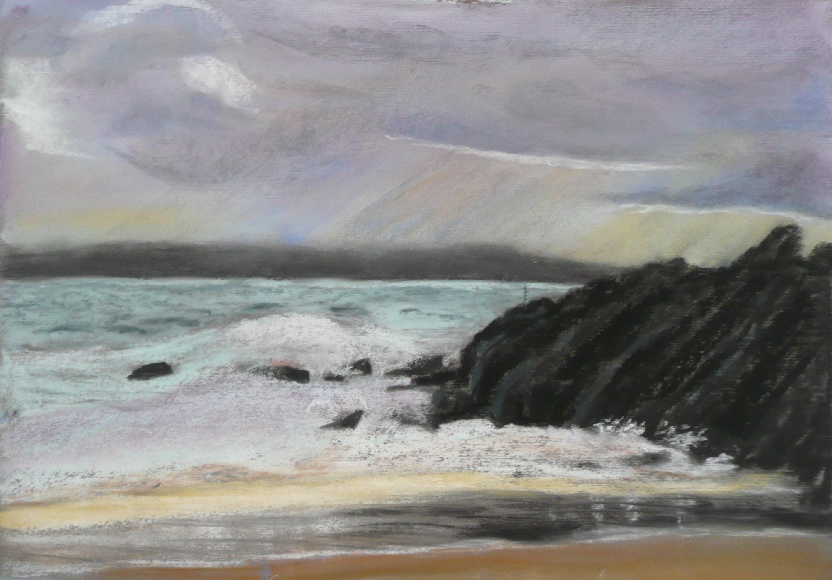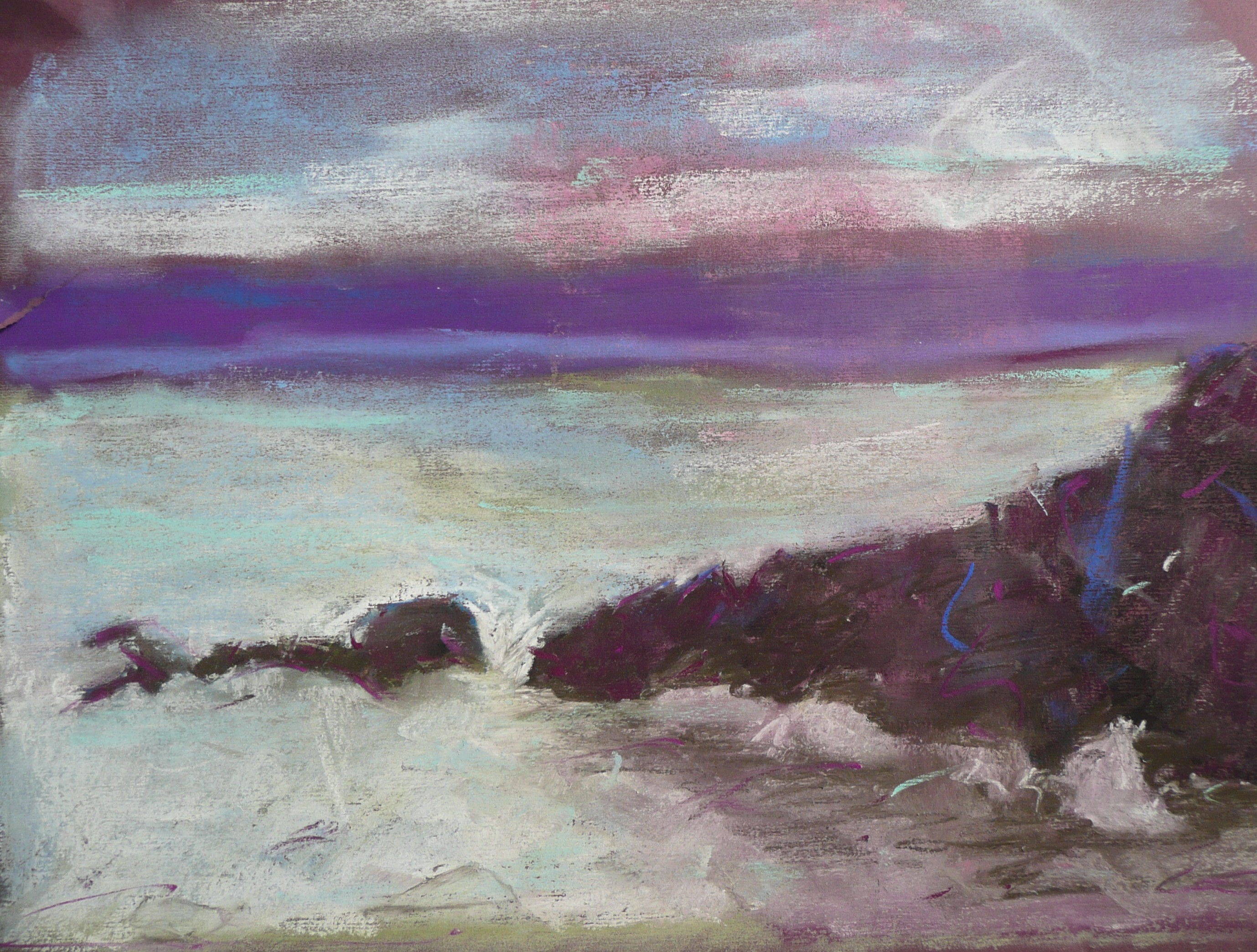 This post showcases work in charcoal and pastel, produced over five Tuesday mornings by a group I felt very privileged to teach at Norden Farm Centre for the Arts, Maidenhead. Many thanks to everyone for giving permission for me to show their work on my blog. Focusing on depicting the character of rock formations we also sought to show the energy and force of water flowing over and around them. Some already had good drawing skills and colour was more of a challenge, especially for those more accustomed to mixing liquid paint. The painting above was made using a very limited palette and I think even the artist was surprised at the way a very pale green and a rather purplish magenta could make lilac greys in the sky and sea.