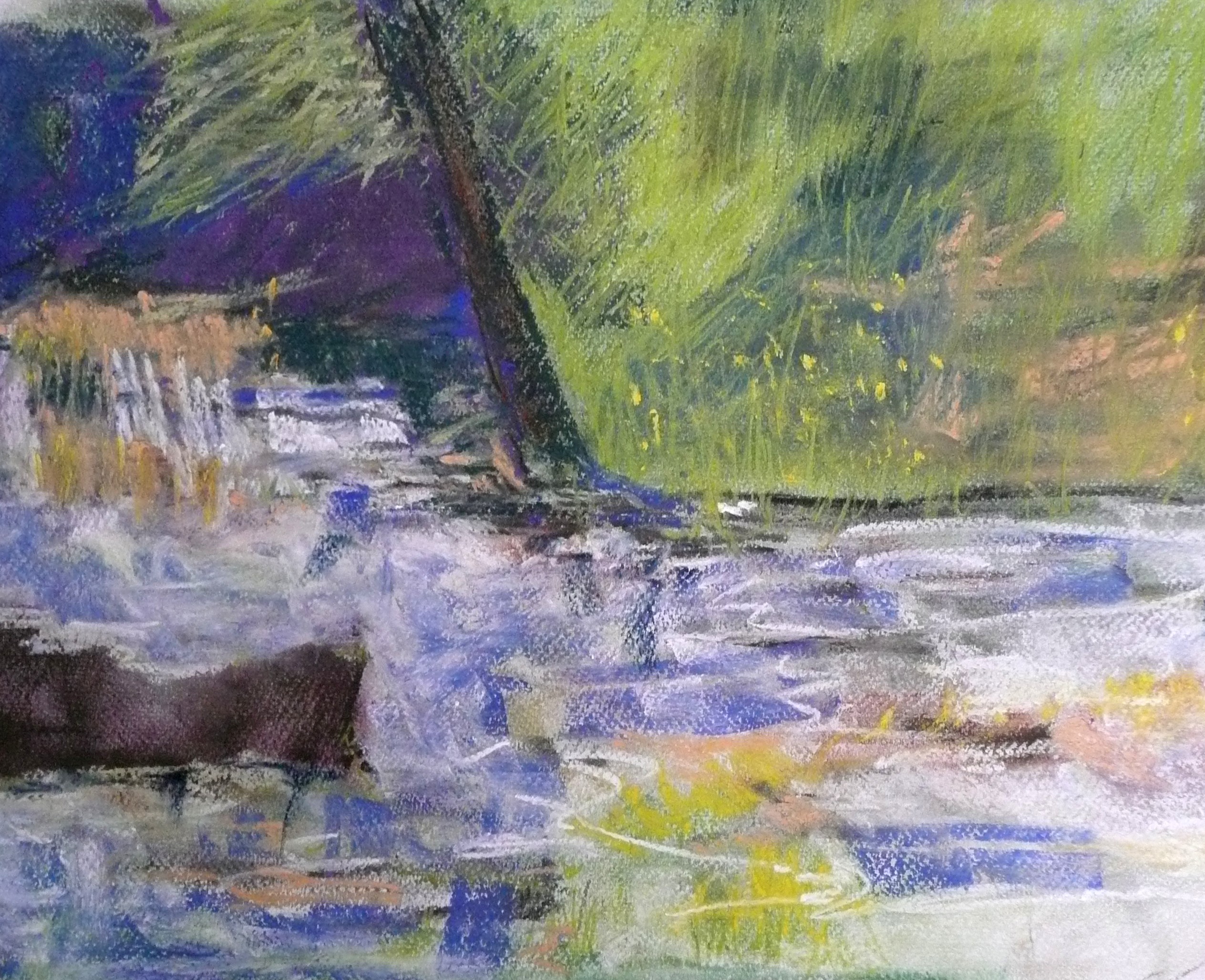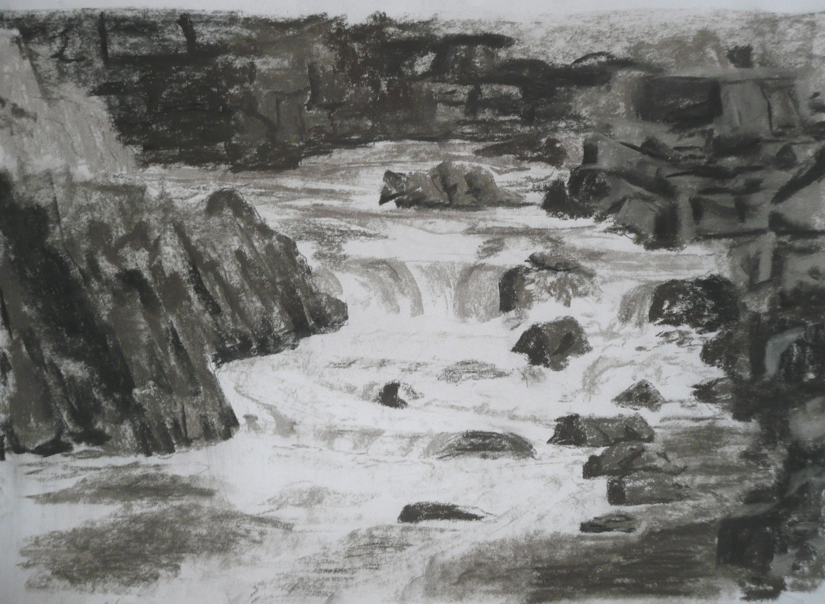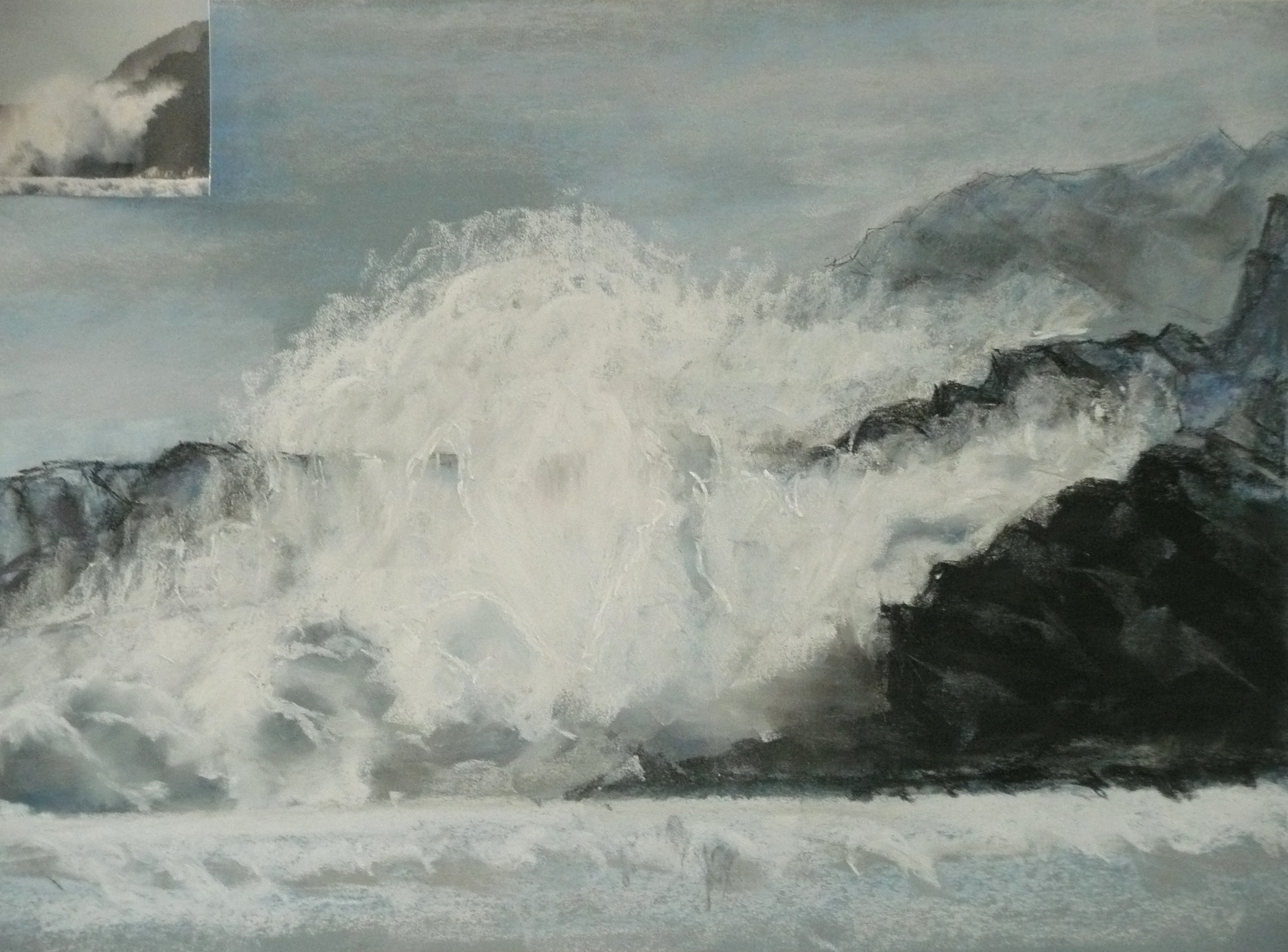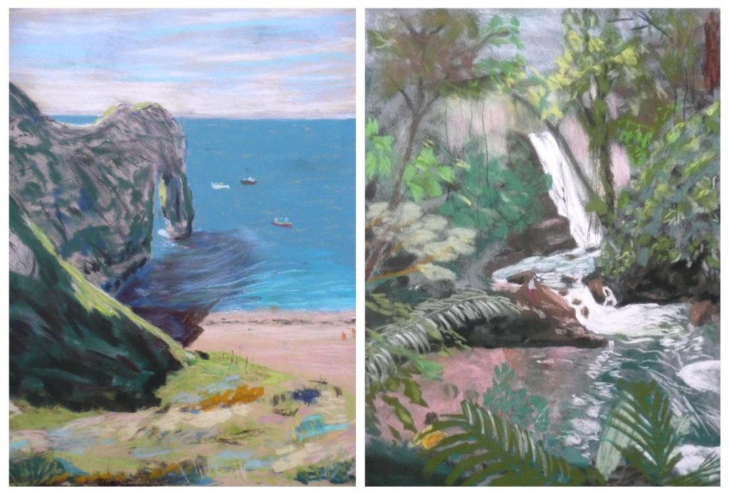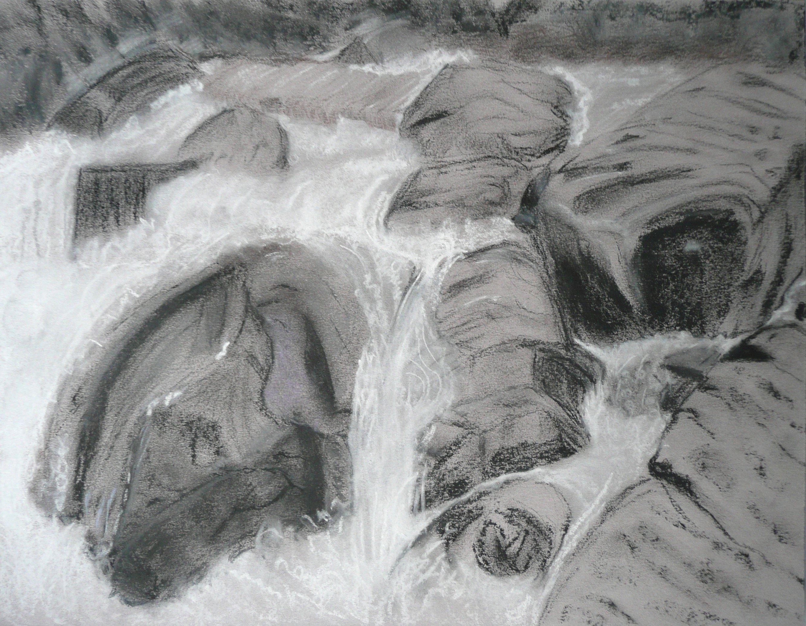 This post showcases work in charcoal and pastel, produced over five Tuesday mornings by a group I felt very privileged to teach at Norden Farm Centre for the Arts, Maidenhead. Many thanks to everyone for giving permission for me to show their work on my blog. Focusing on depicting the character of rock formations we also sought to show the energy and force of water flowing over and around them. Some already had good drawing skills and colour was more of a challenge, especially for those more accustomed to mixing liquid paint. The painting above was made using a very limited palette and I think even the artist was surprised at the way a very pale green and a rather purplish magenta could make lilac greys in the sky and sea.