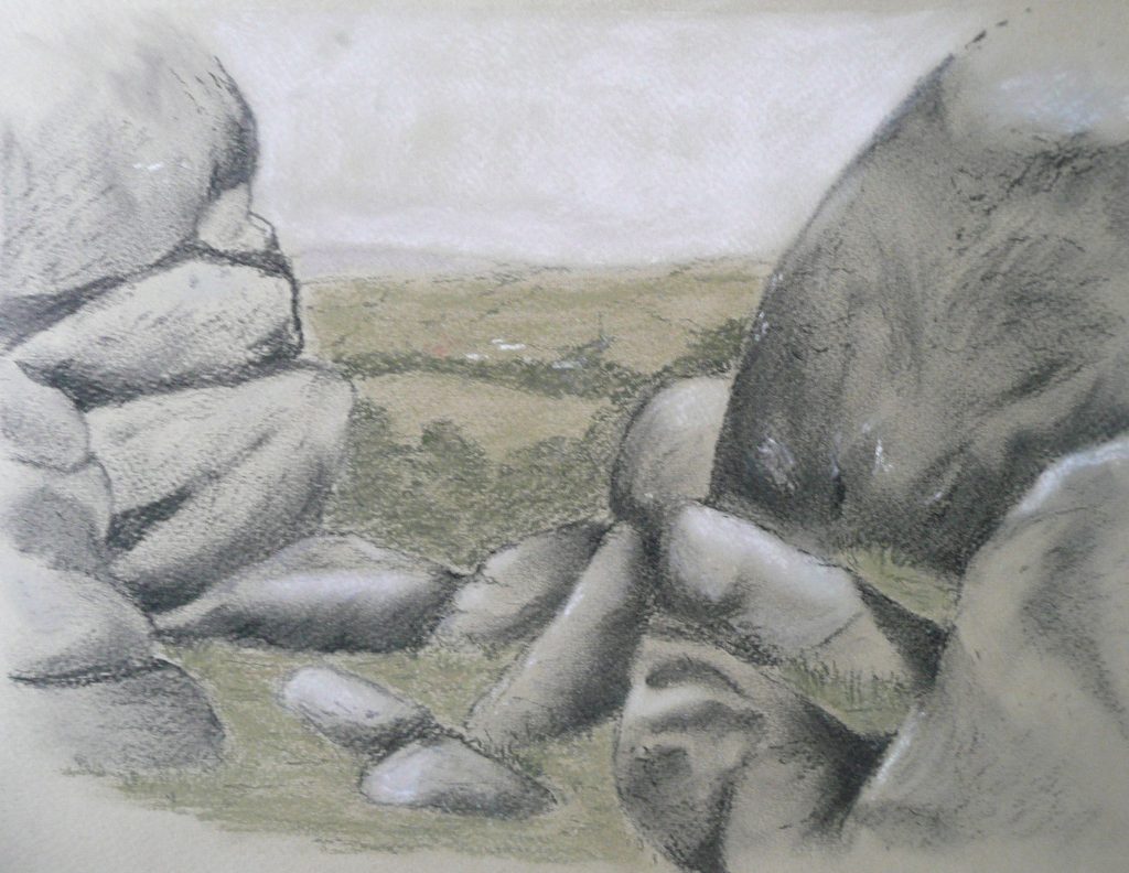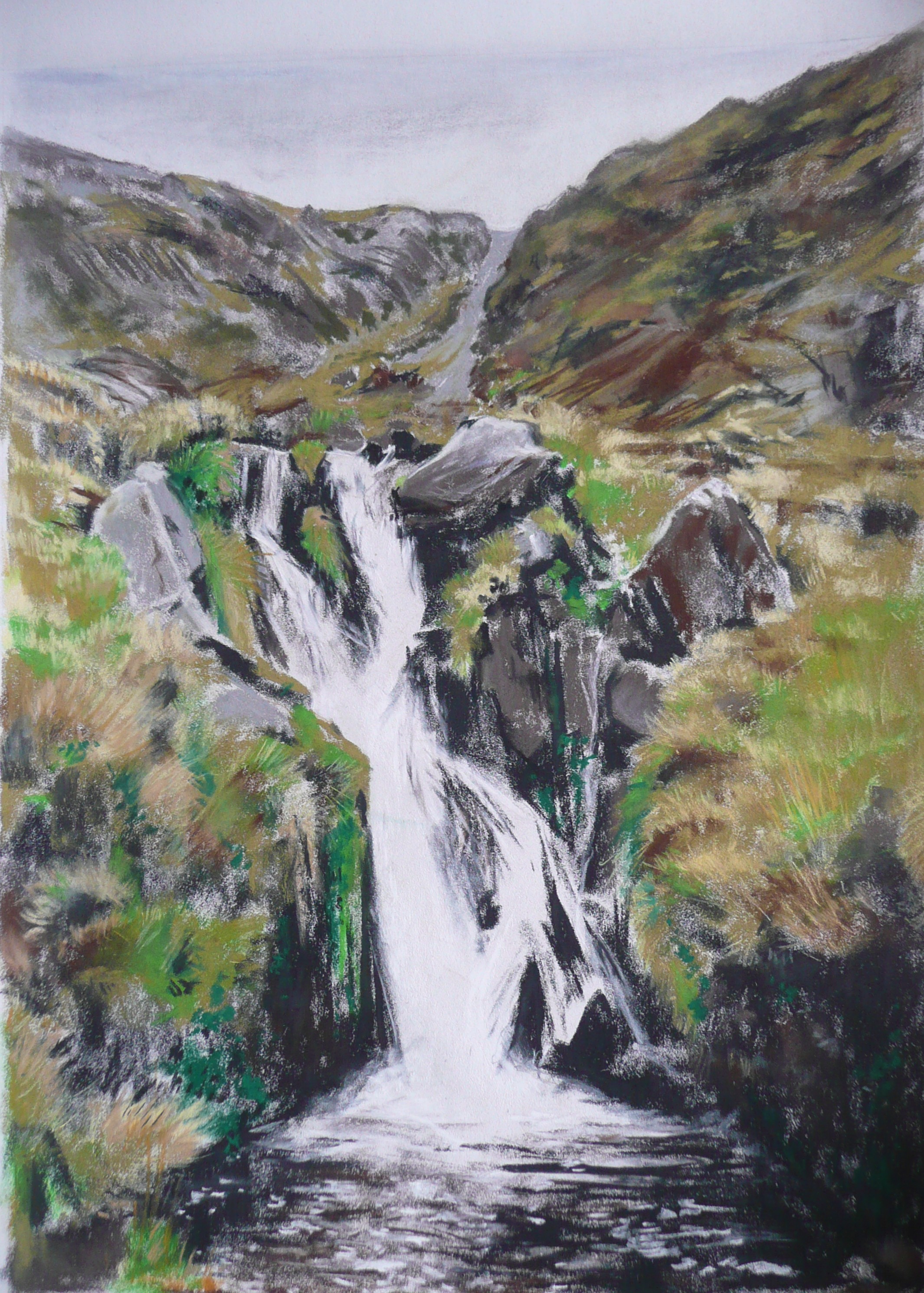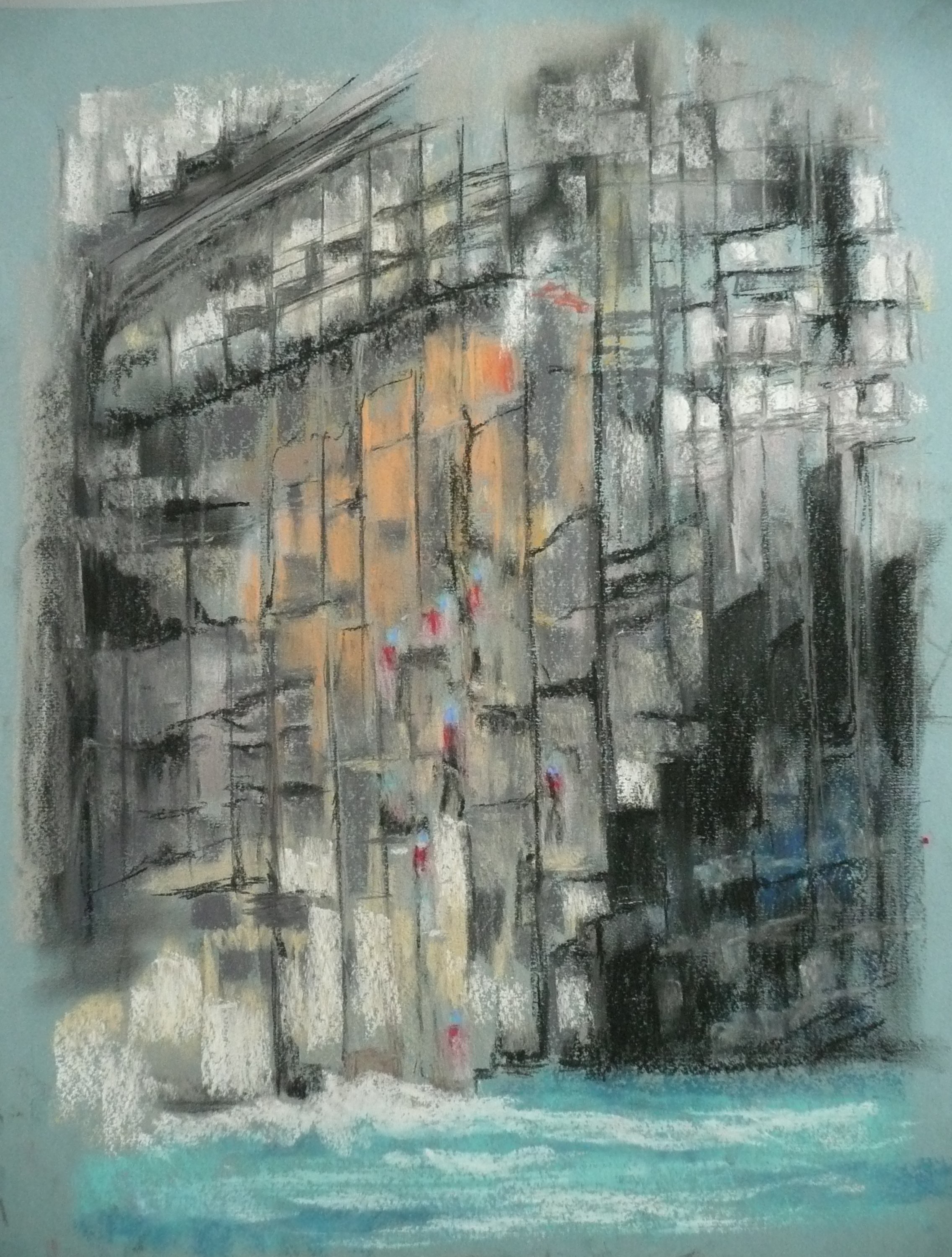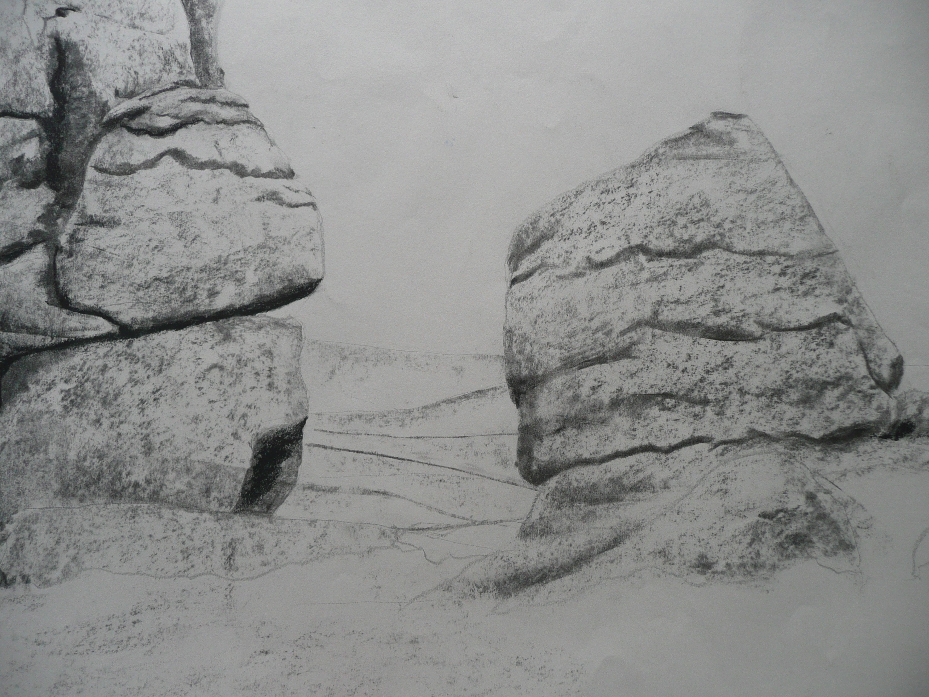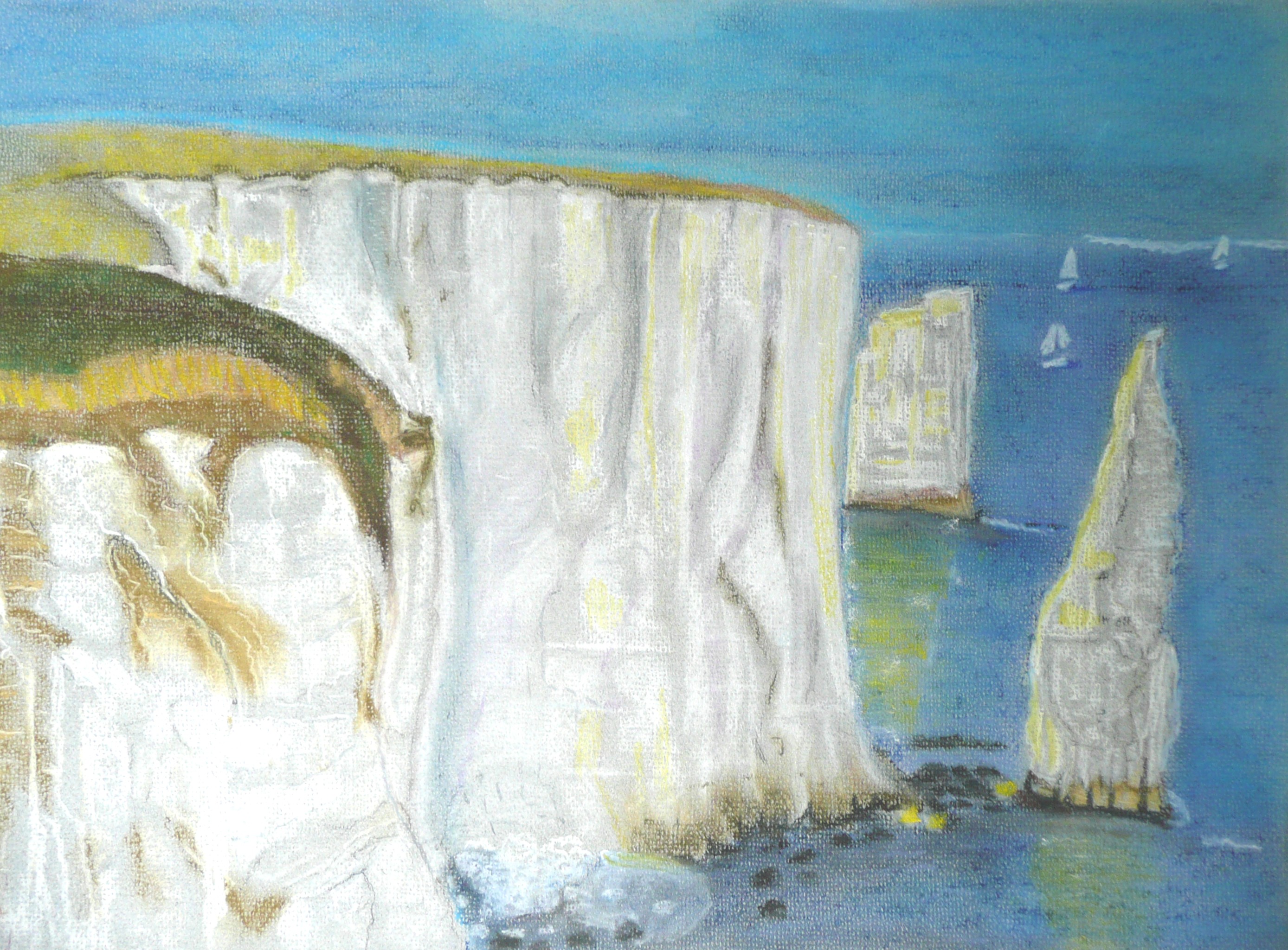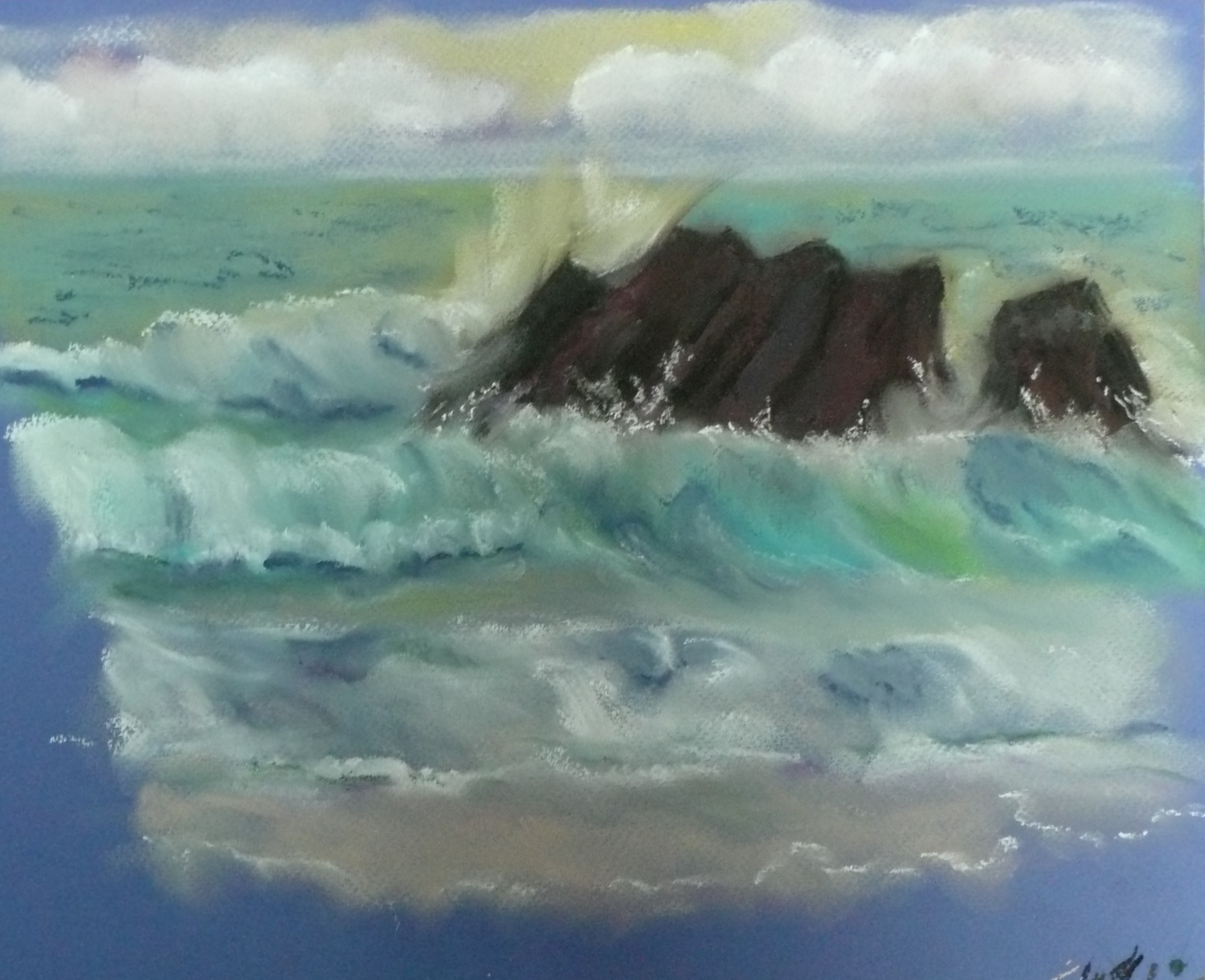 This post showcases work in charcoal and pastel, produced over five Tuesday mornings by a group I felt very privileged to teach at Norden Farm Centre for the Arts, Maidenhead. Many thanks to everyone for giving permission for me to show their work on my blog. Focusing on depicting the character of rock formations we also sought to show the energy and force of water flowing over and around them. Some already had good drawing skills and colour was more of a challenge, especially for those more accustomed to mixing liquid paint. The painting above was made using a very limited palette and I think even the artist was surprised at the way a very pale green and a rather purplish magenta could make lilac greys in the sky and sea.