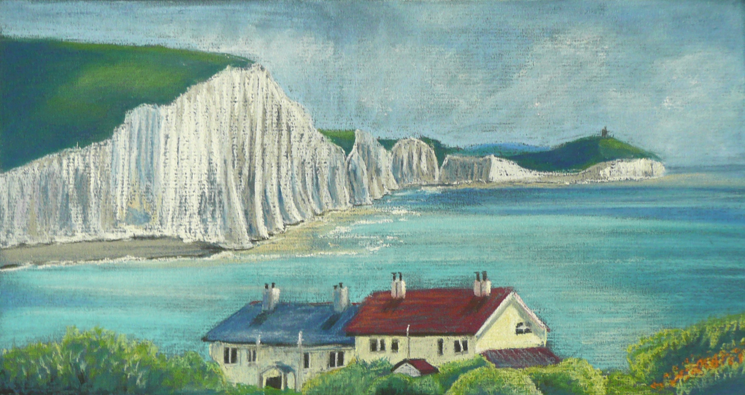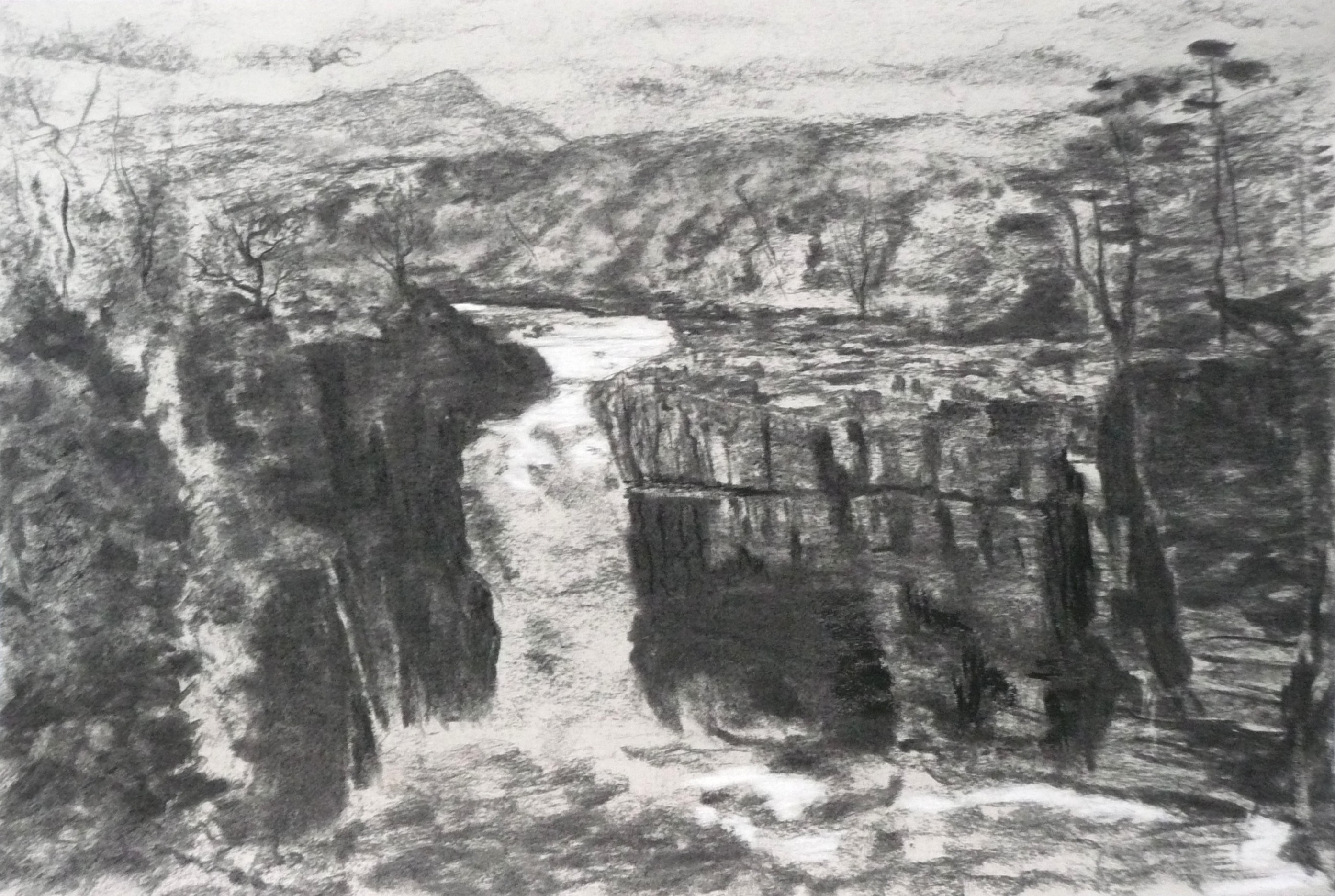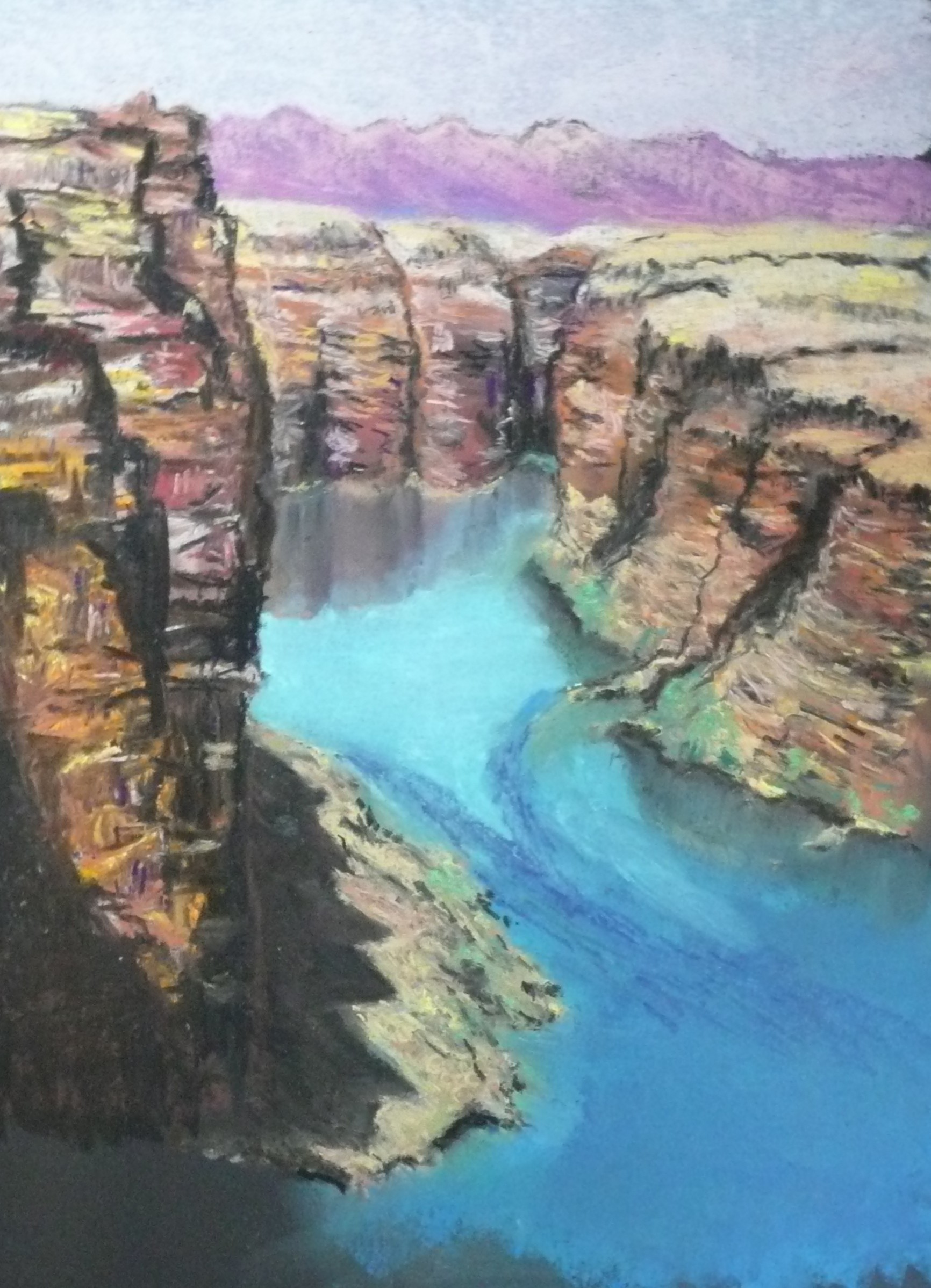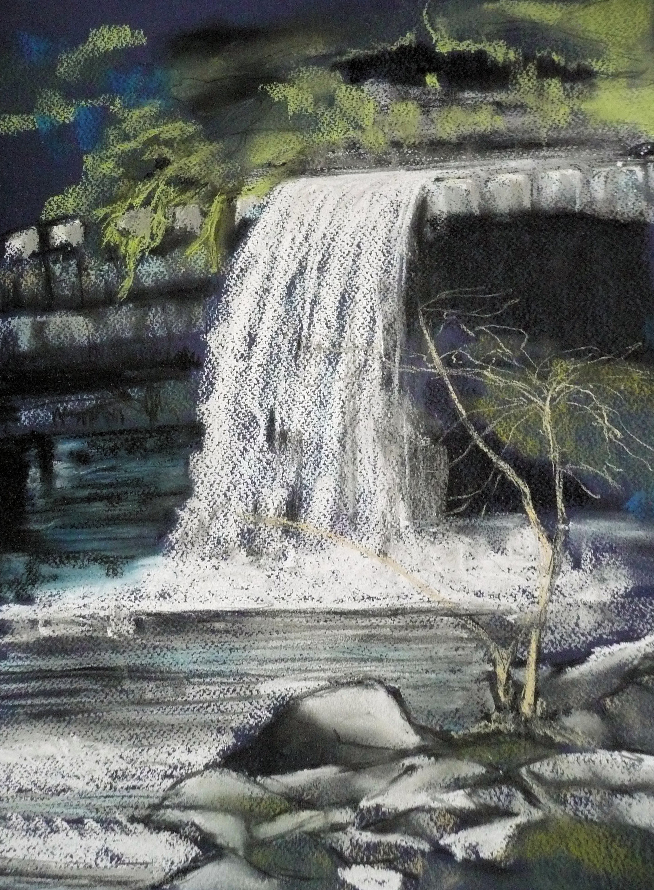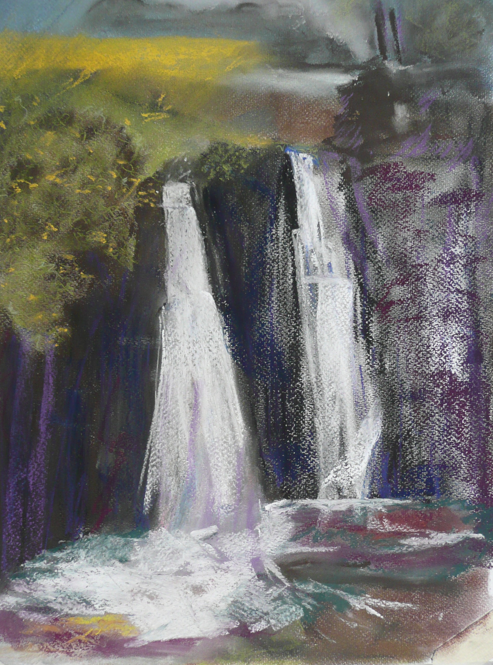 This post showcases work in charcoal and pastel, produced over five Tuesday mornings by a group I felt very privileged to teach at Norden Farm Centre for the Arts, Maidenhead. Many thanks to everyone for giving permission for me to show their work on my blog. Focusing on depicting the character of rock formations we also sought to show the energy and force of water flowing over and around them. Some already had good drawing skills and colour was more of a challenge, especially for those more accustomed to mixing liquid paint. The painting above was made using a very limited palette and I think even the artist was surprised at the way a very pale green and a rather purplish magenta could make lilac greys in the sky and sea.