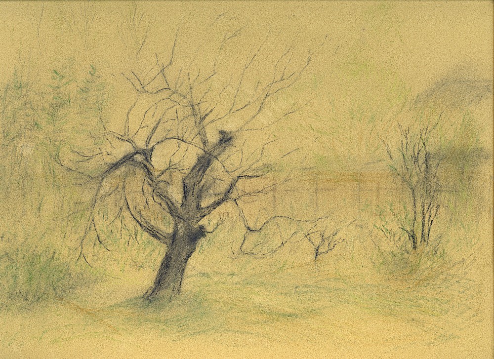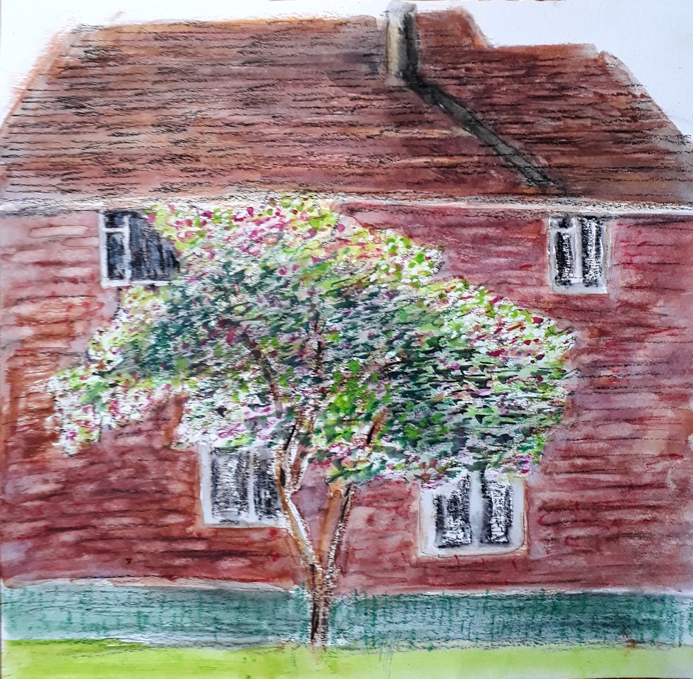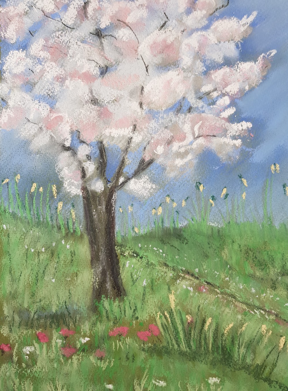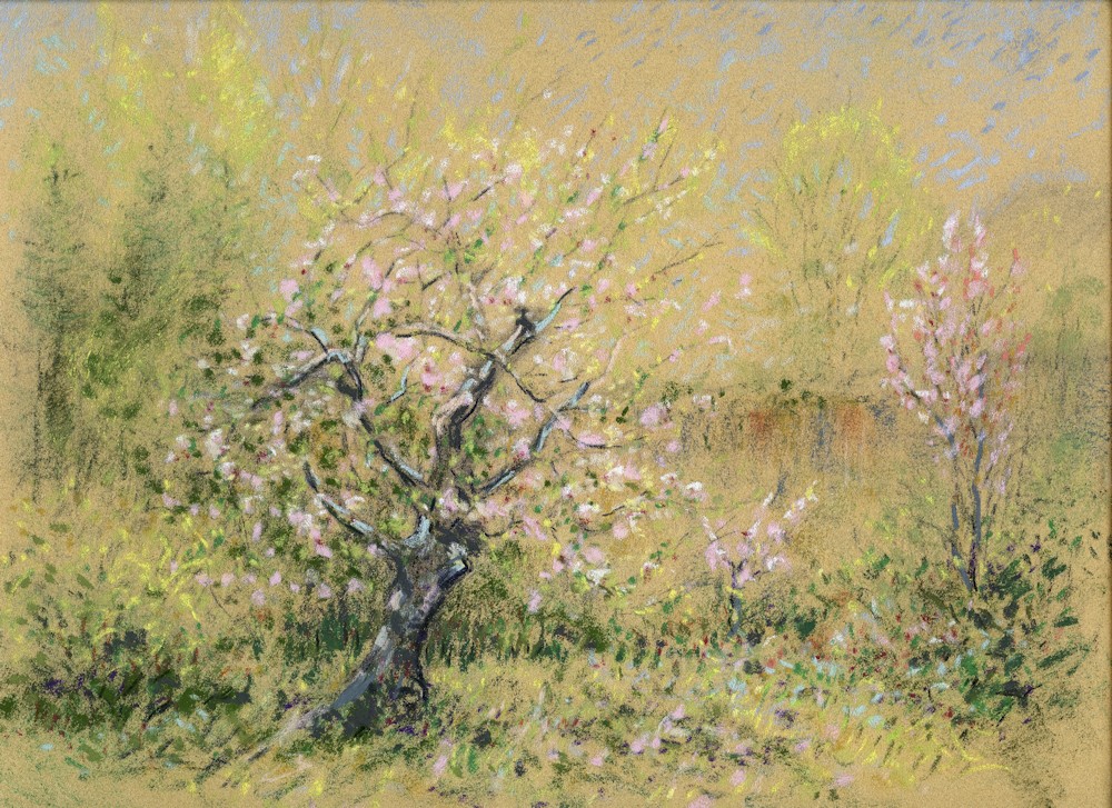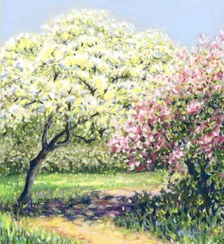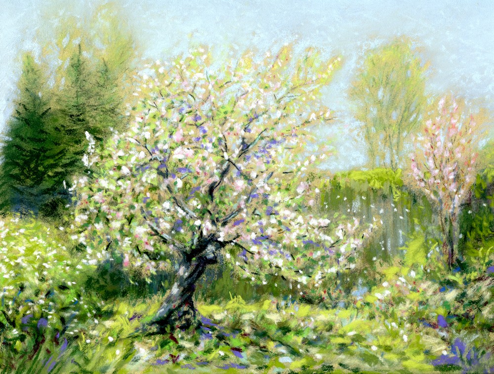 A complex branching system can be daunting but as you can see from the finished work at the beginning of this post it can be reduced to little dots and dashes of pastel. I hope to finish the ‘Apple Tree in progress’ tomorrow or Wednesday and will insert the final stage sometime this week.