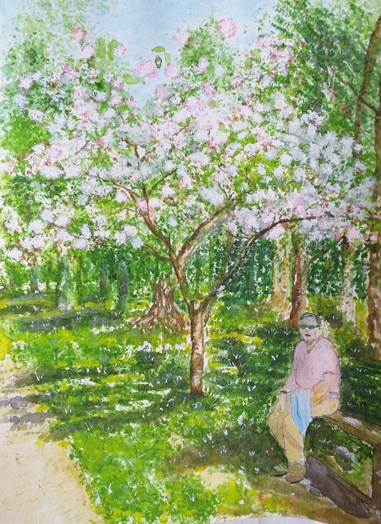 There is a fine balance between getting the essential character of the tree by getting the angles of the main trunks and branches right and the challenge of overlaying it with blossom and leaves in a way that does not appear overly detailed or fussy, but does give an idea of the tree’s character. If the blossom is all the same tone it can appear quite flat so look at where the light is coming from and observe the shadow areas well.