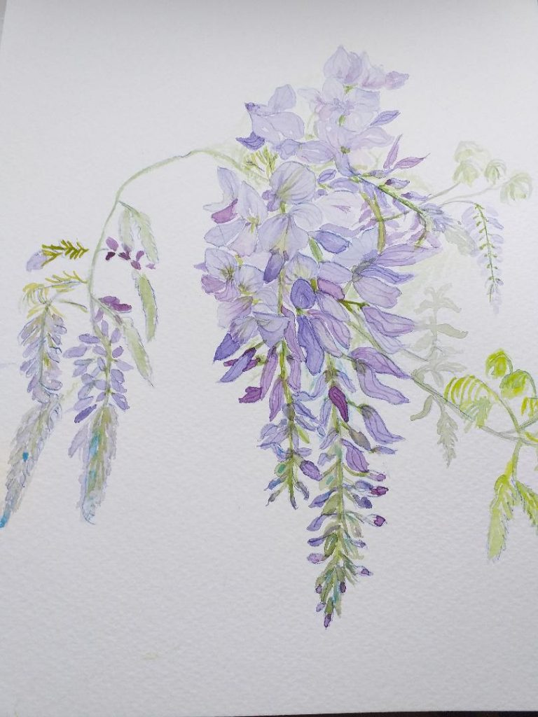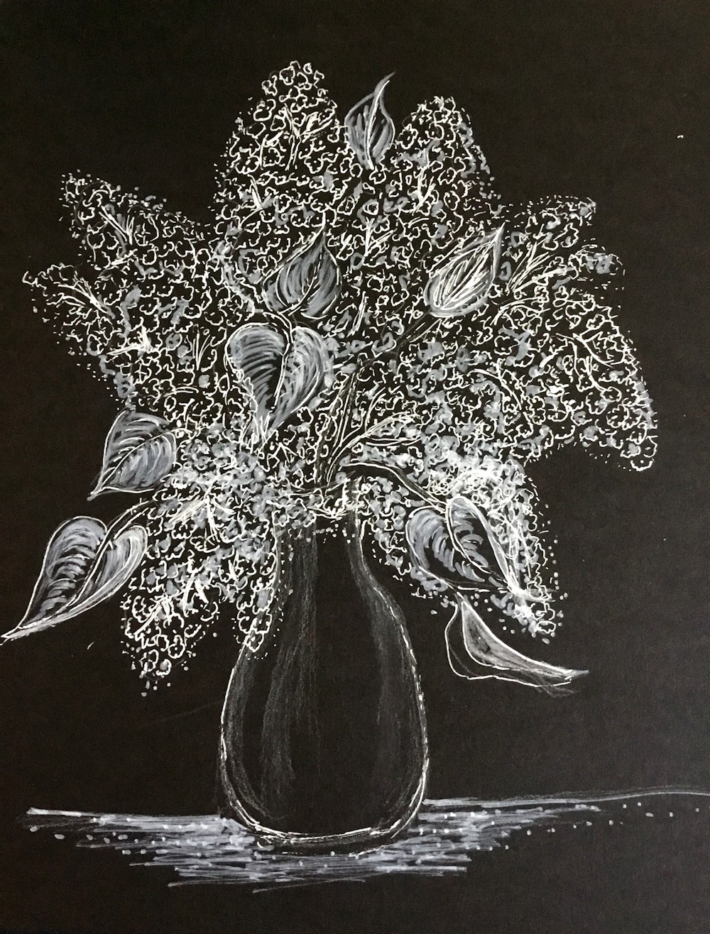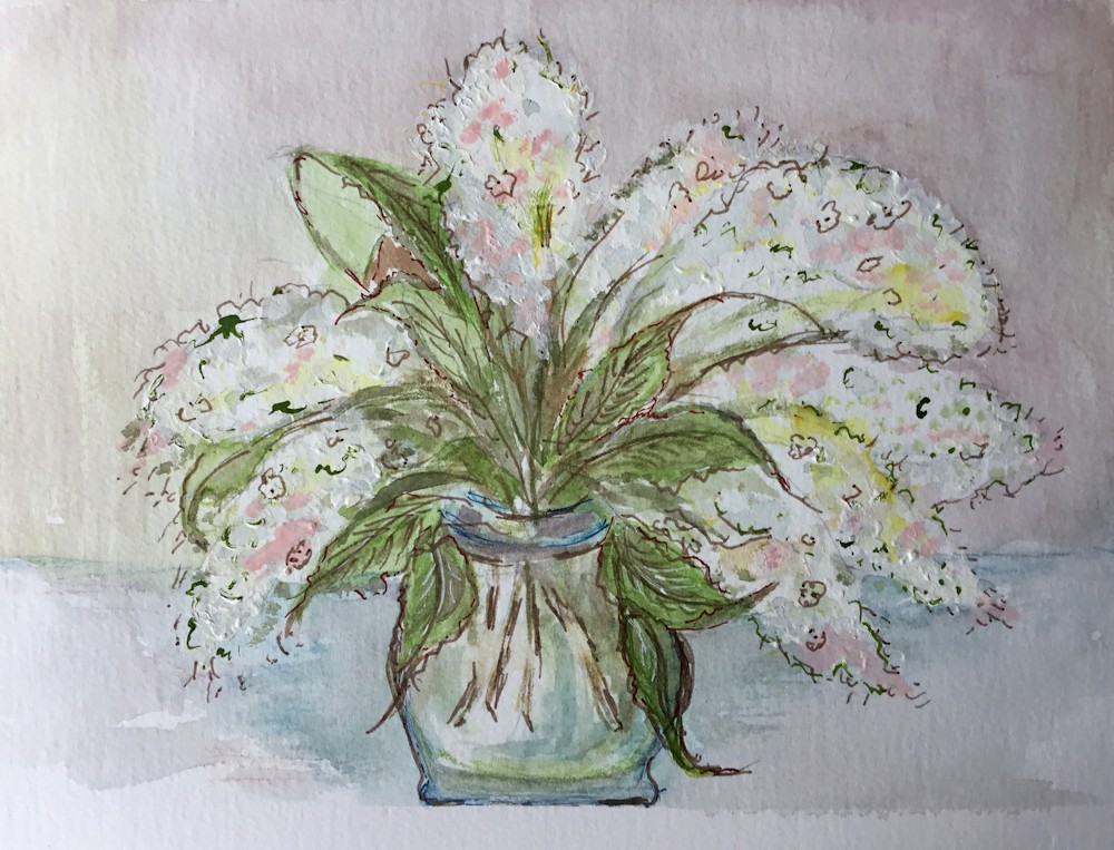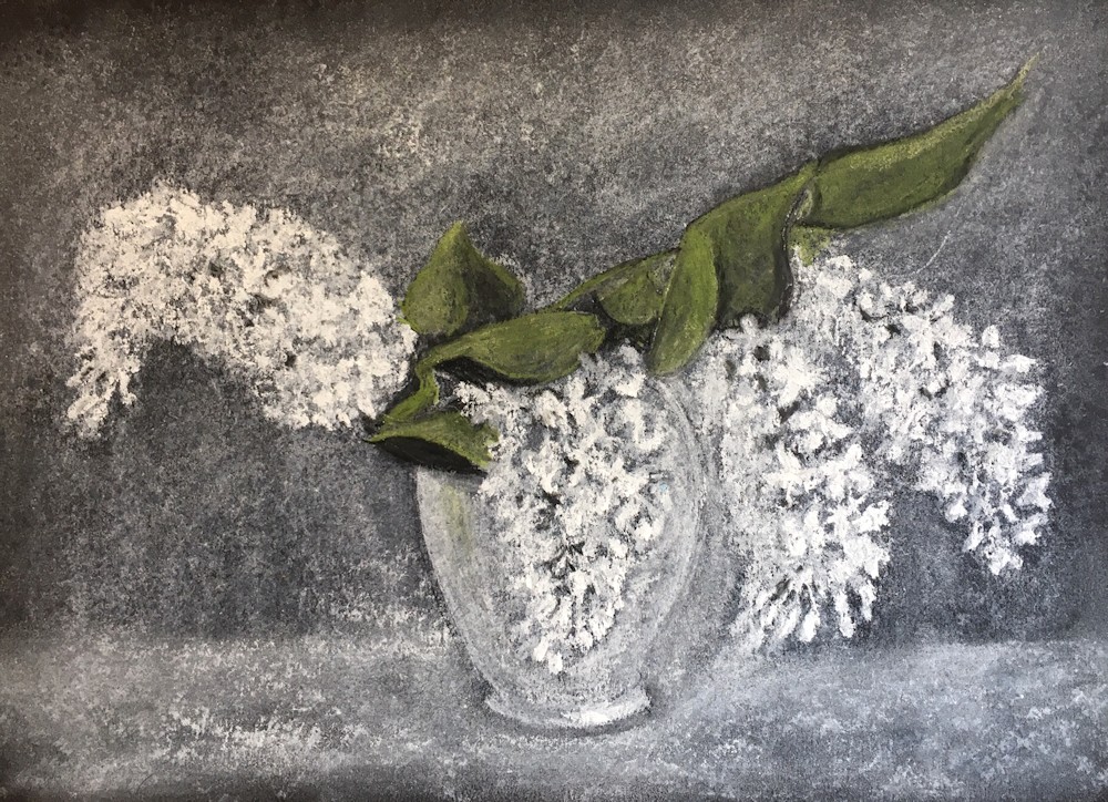 Heather has very skillfully suggested the lilacs without drawing every tiny flower.