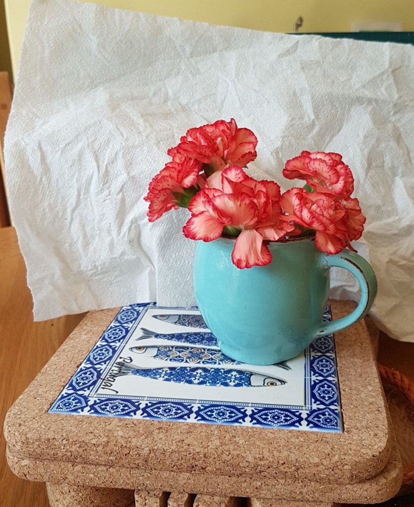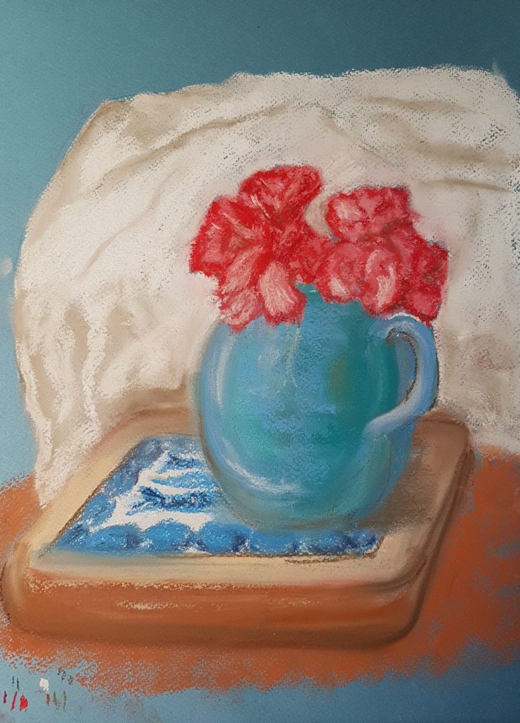 Ruth has made a bold statement with colour. She has picked up the turquoise colour of the jug both in the tile and in the background behind the white backdrop, and in front of the tiled stand. This gives the whole painting a unity and at the same time our focus remains on the flowers and their dominating red. The white backdrop provides a great foil to the red flowers in tone and colour. The warm terracotta tile provides a complementary colour to the turquoise and links back to the warm reds of the flowers. This painting is all about shape and colour.