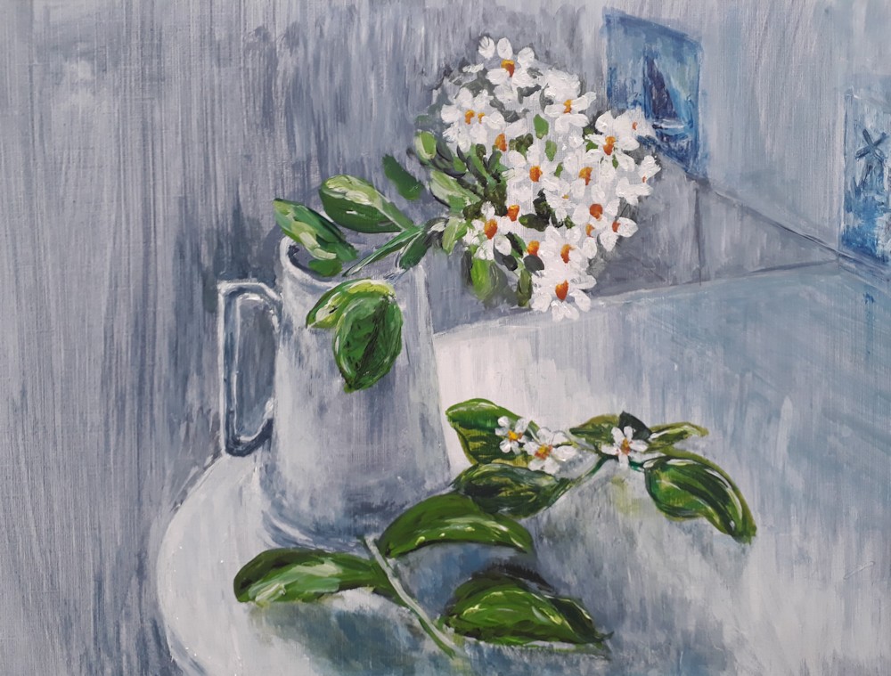 Vivienne has made an exciting composition with tone, using light against darker areas effectively. The curve of the table, shape of the jug and diagonal with the two tiles in subtle blues at the upper right, gives this painting a strong abstract framework.