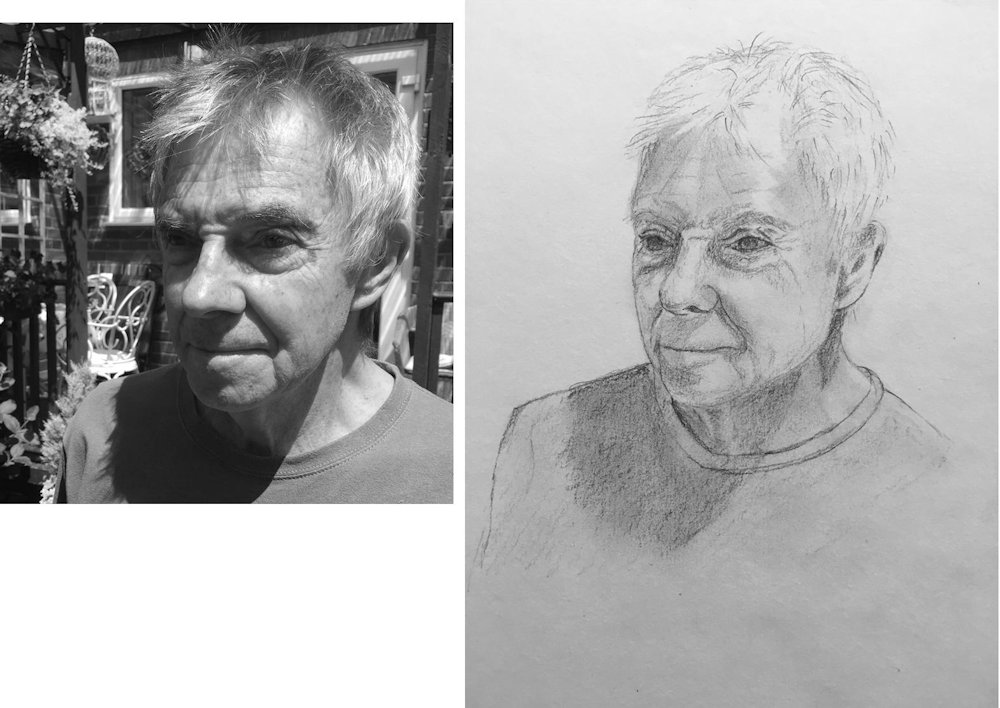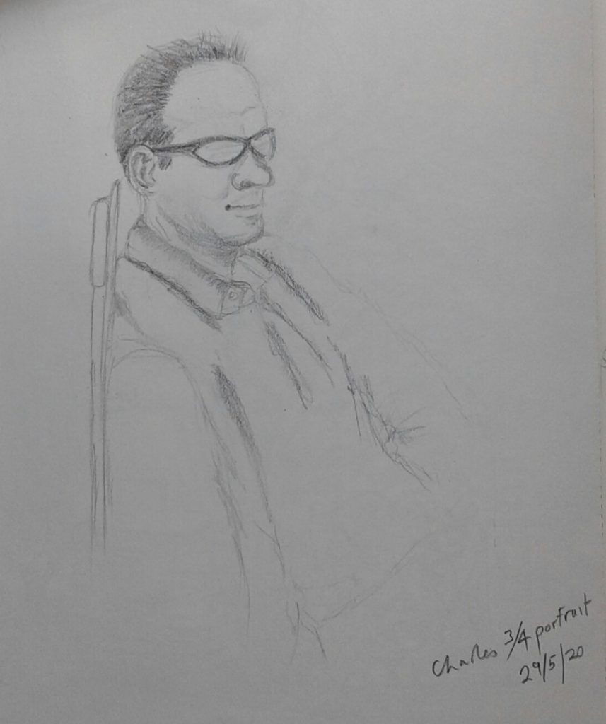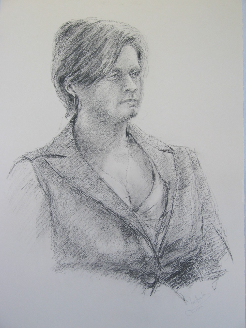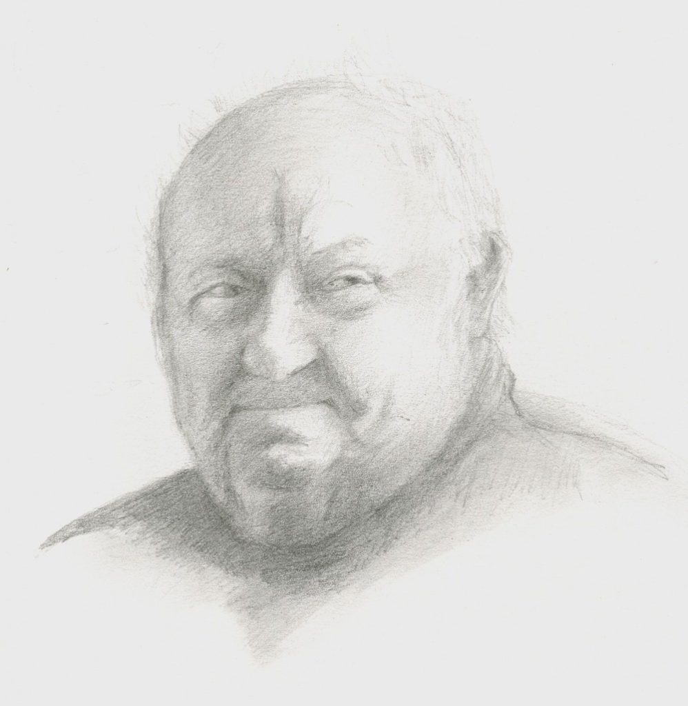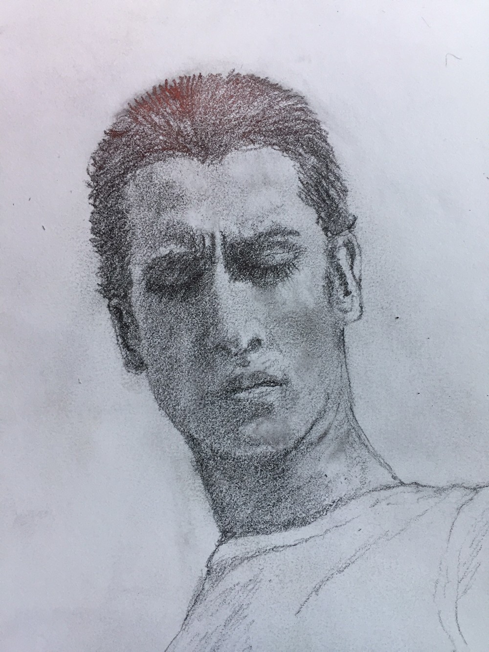 Chris by Heather; Good framework of shapes to build on; needs more tone generally except in the very lightest areas and a lot more tone round the eyes, across the brow ridge and on the dark side of his face.