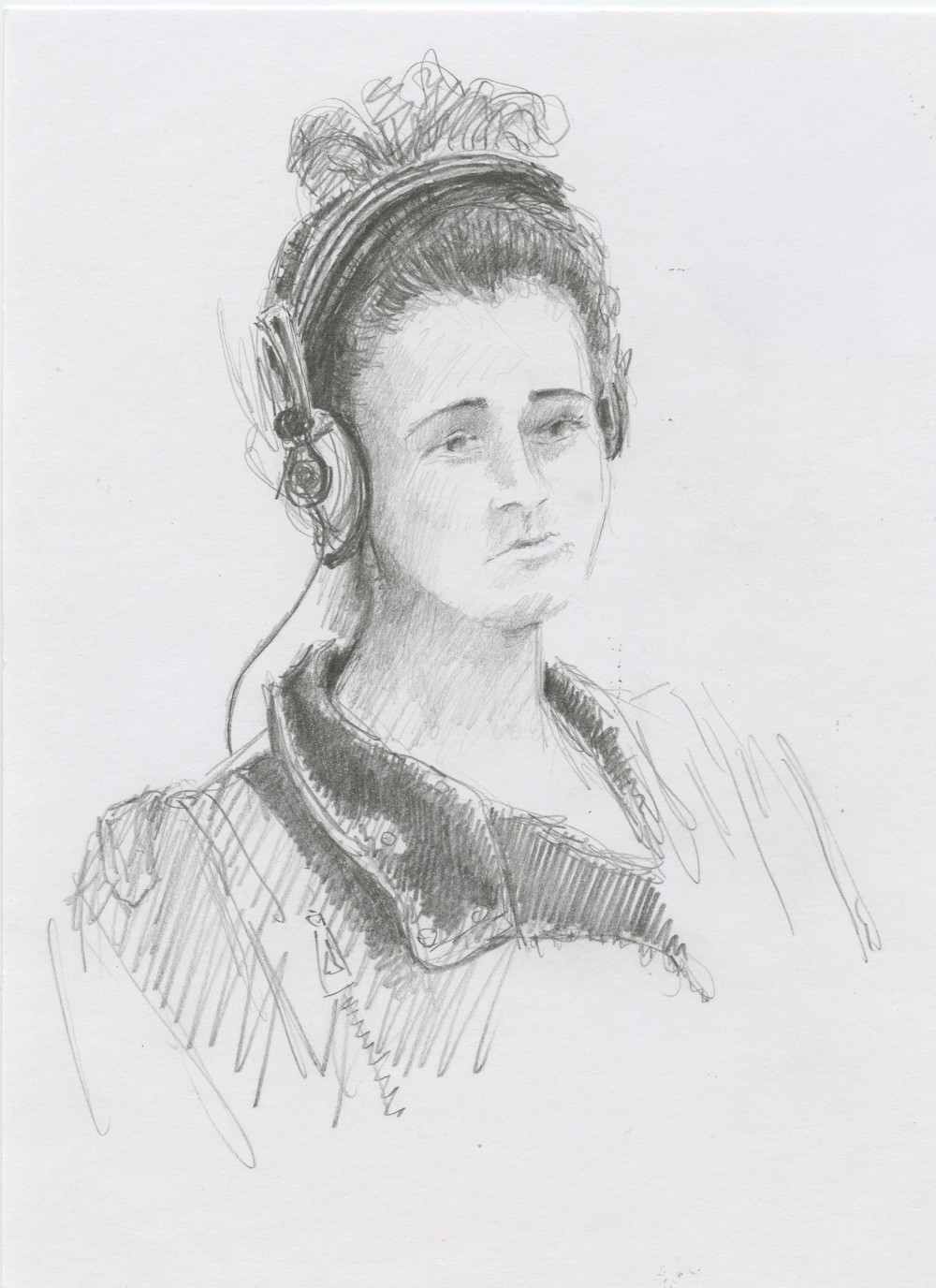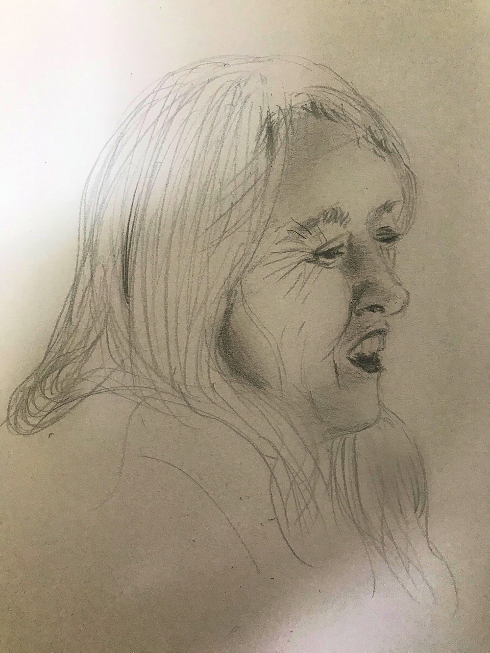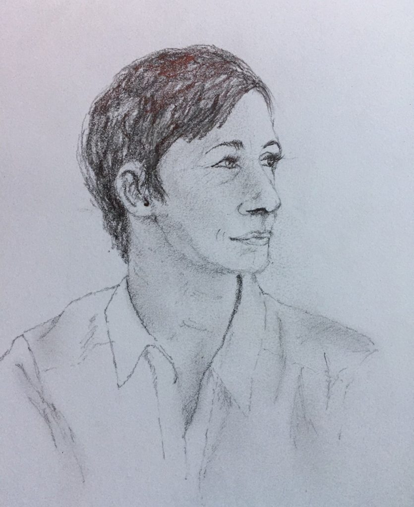 Mary Beardsley drawn from television by Shane; this is great, I can almost hear her speaking. Look at how some deft tone has helped us make sense of the form, while the line gives us the shape of her features and head. The mark making especially round the eye nearest to us and treatment of the hair are direct and not overly fussy. Drawing from people that are moving is not easy even when already translated into 2D on a screen but often produces lively drawings!
