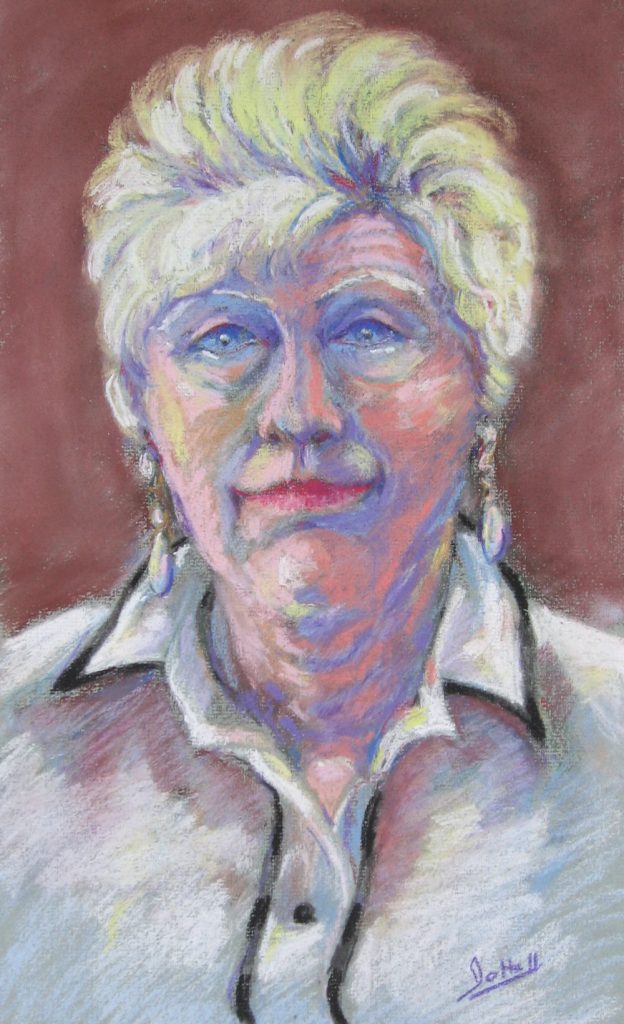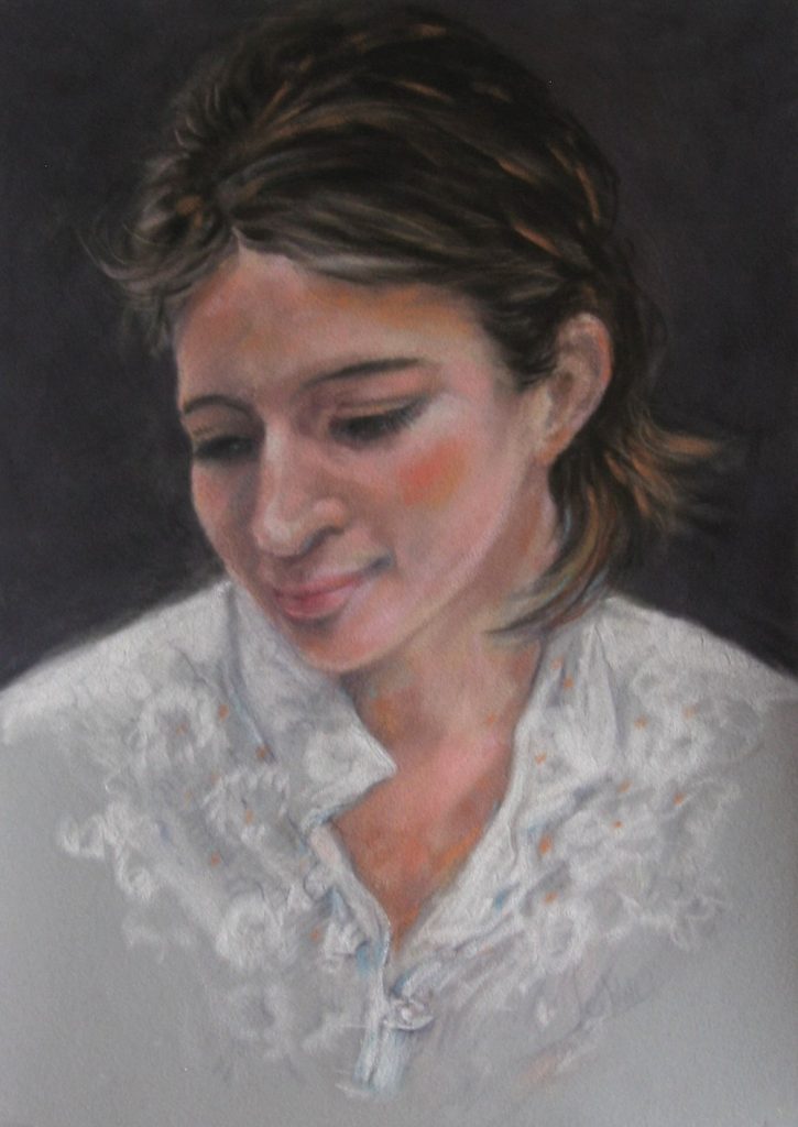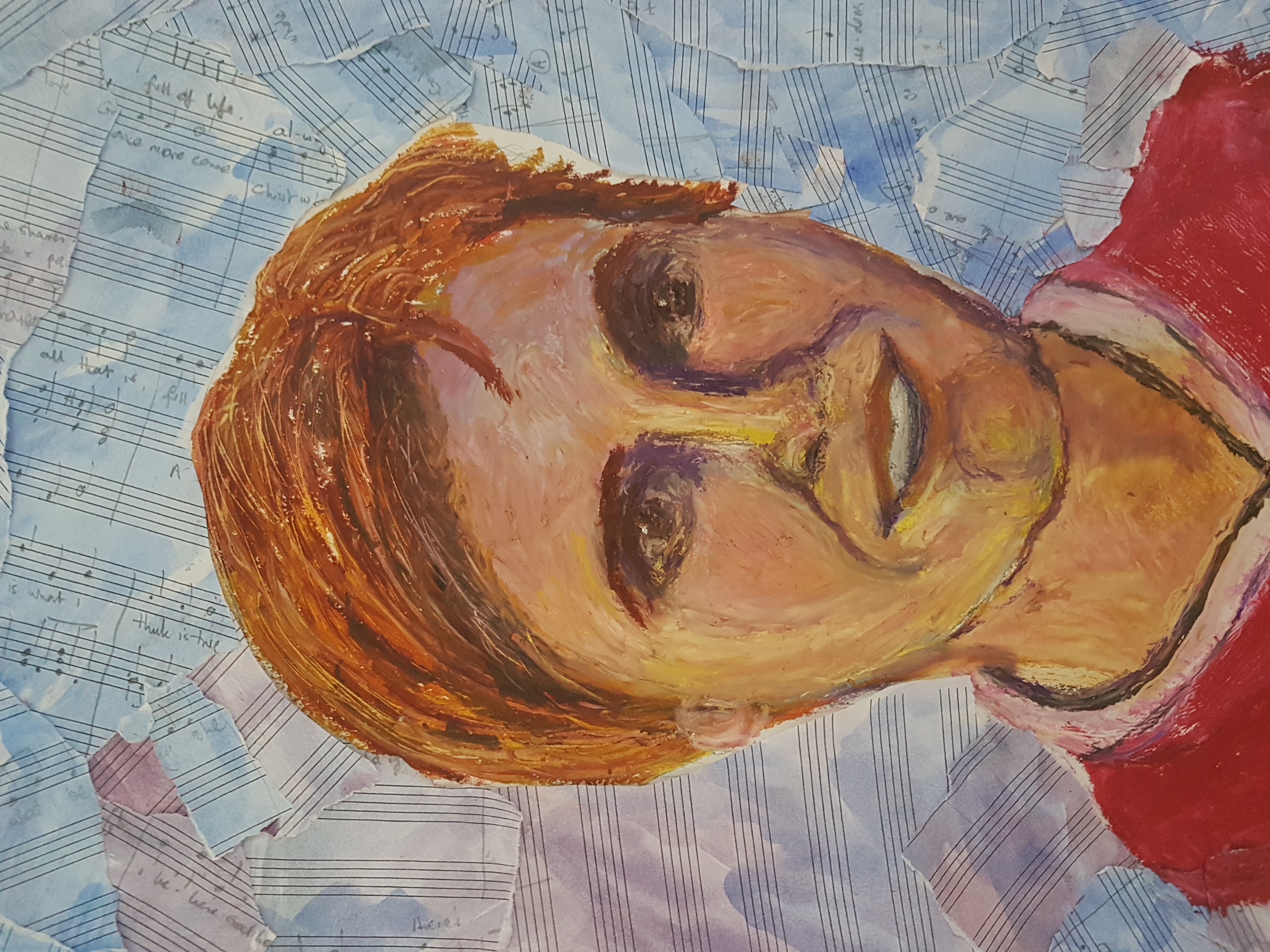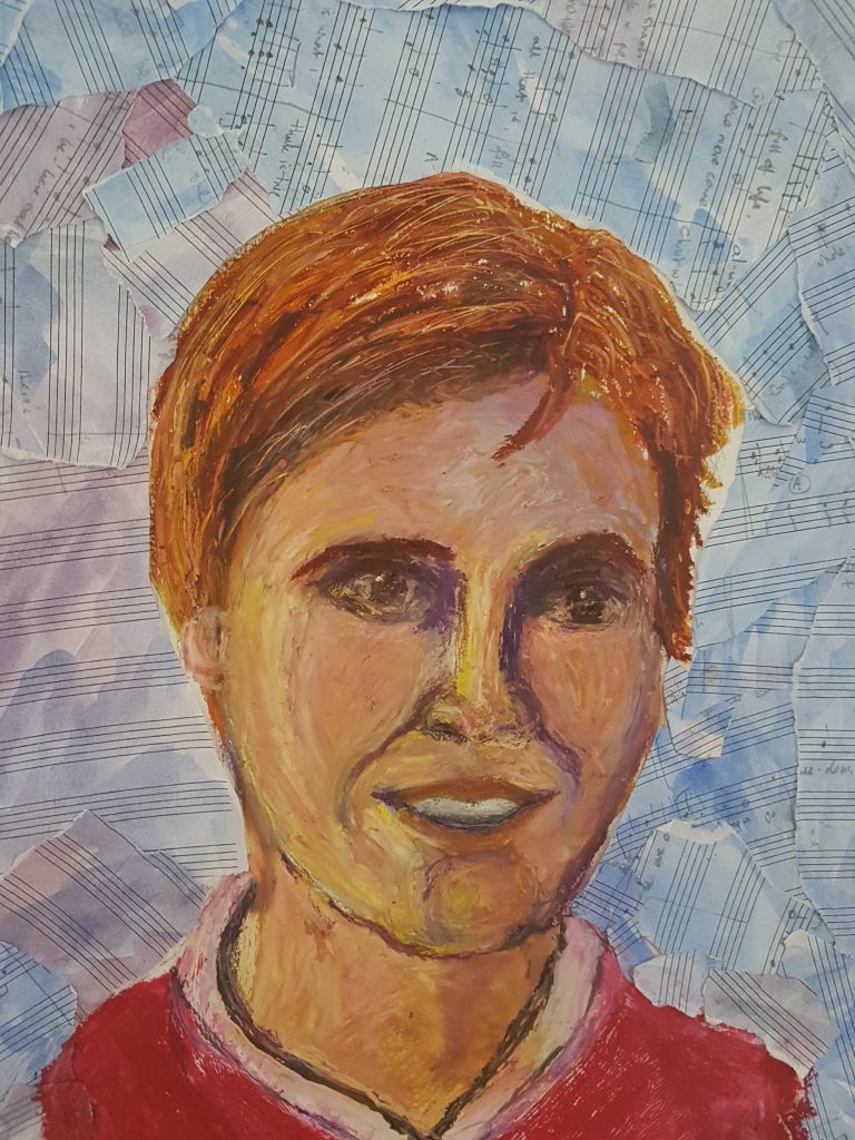 Tania by Ruth in oil pastel and collage. Tania is a musician, hence the background; another lively portrait with well observed tones.