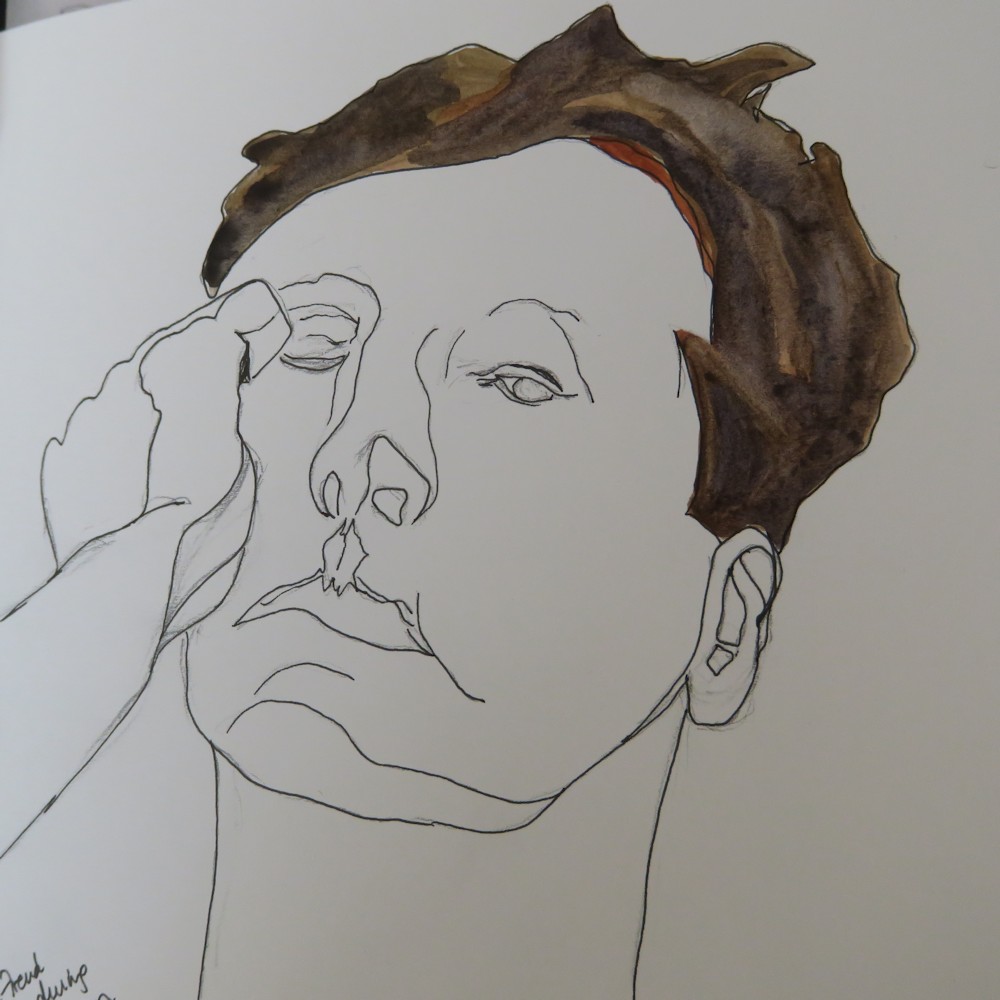Another drawing from Maria: this time her version of a work by Lucien Freud, again with the head tilted up. This is very convincing as we can see the underside of the chin and nostrils, the eyes correctly positioned and the also the ear. Really good idea to try drawing like this with pen from life as well as from other artists and photo reference.