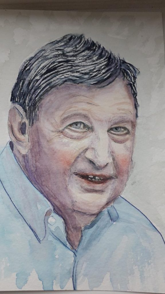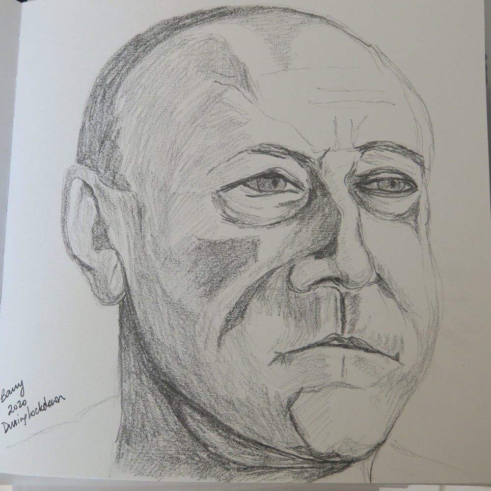 Barry in Lockdown by Maria; a very powerful image, the direction of the hatching giving a very sculptural feel to this portrait head. It looks as though Barry is looking up from the position of the eyes and the fact that we can see almost under his chin.