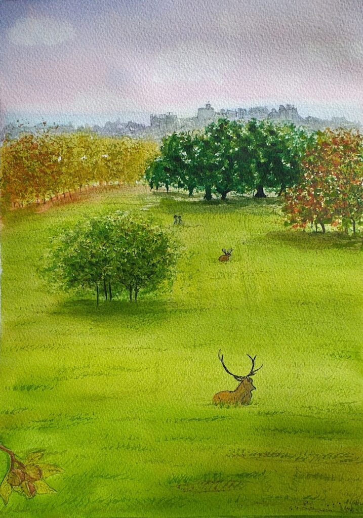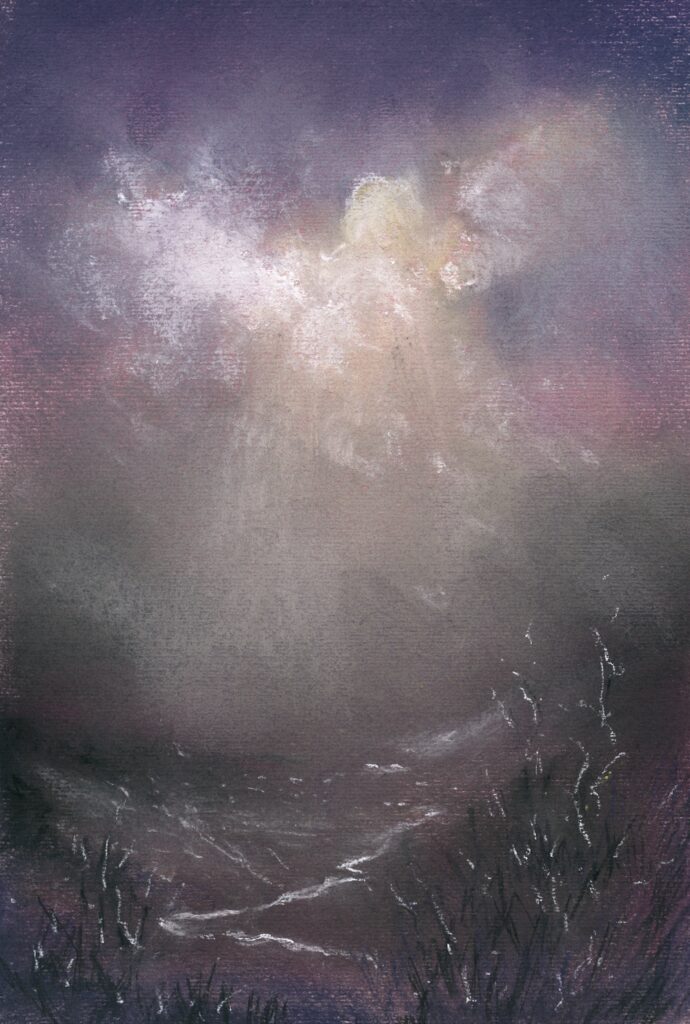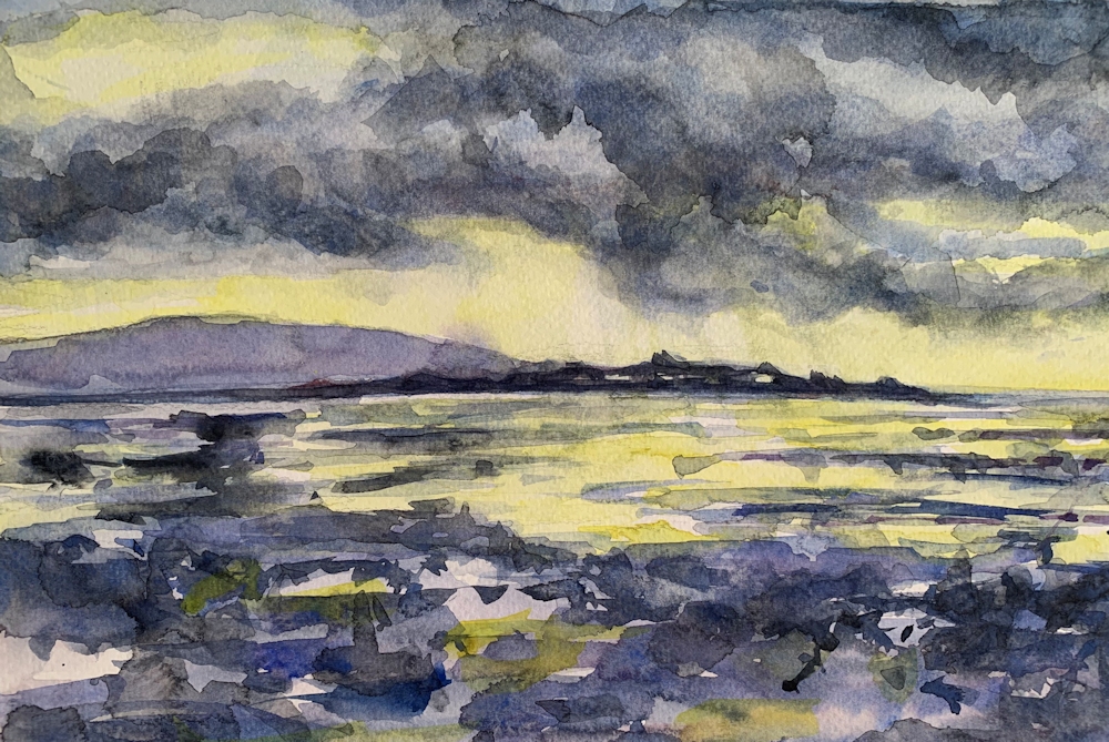 This week you may work in pastel which will work very well on a dark paper, perhaps a very dark blue or even a dark burgundy colour as in the demonstration piece below. If you are working in watercolour you may choose a white paper as in the illustration above, or if you consider working in gouache, or white added to your watercolours, again you may like to choose a dark paper. Pastel papers can be stretched in the same way as watercolour paper, or you could work in gouache on an off cut of mount board.