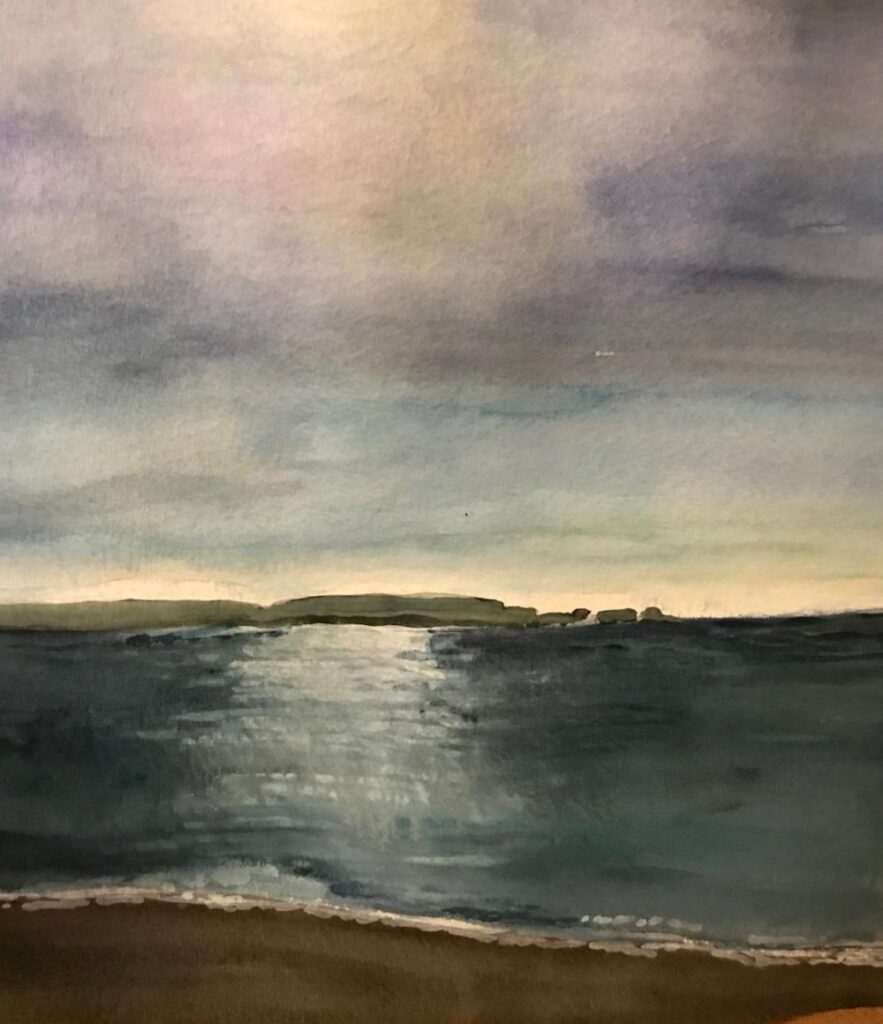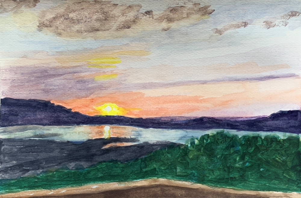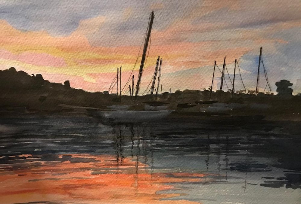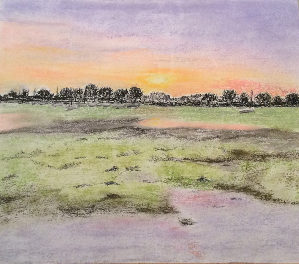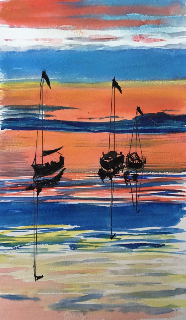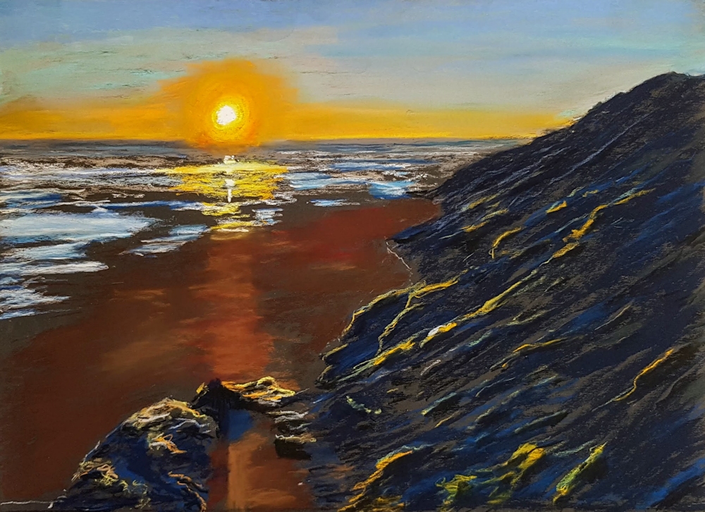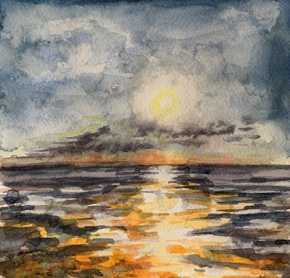 2. Using pastel or watercolour or a watercolour/pastel combination make a painting where the sun is evident in the sky and may also include a reflection of the sun. The reflection may appear as the reflection of the whole sun or as a sparkle on the water.
