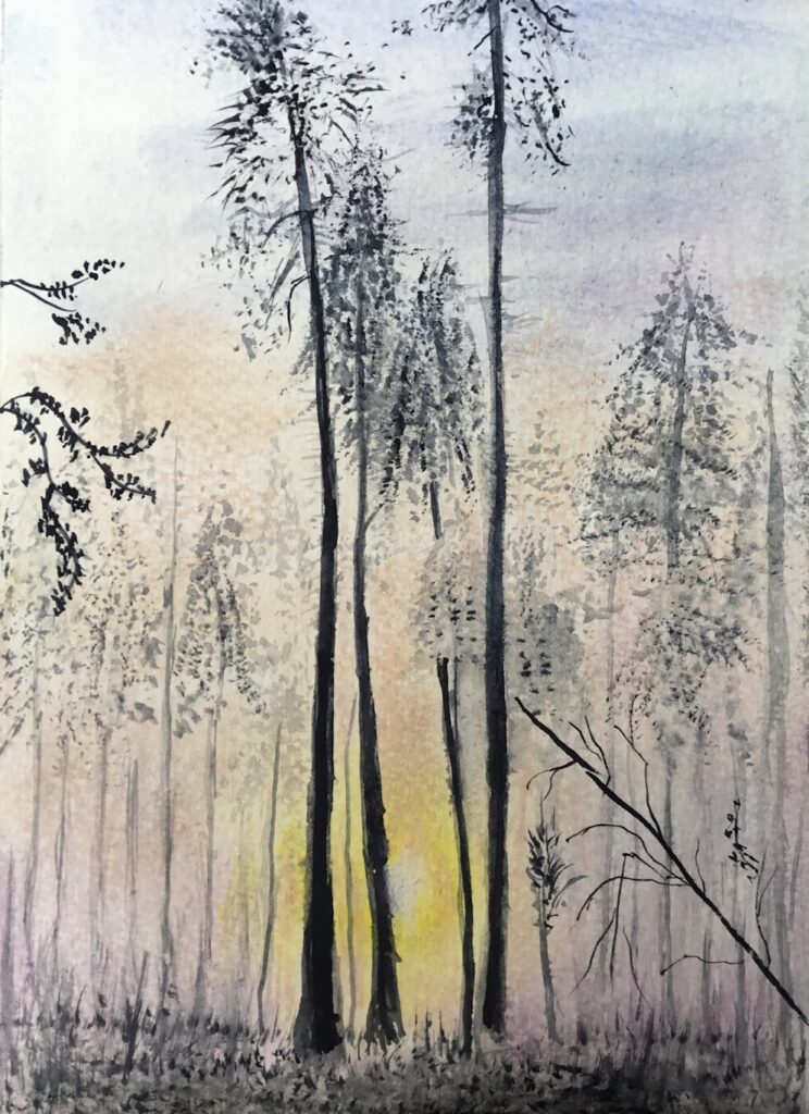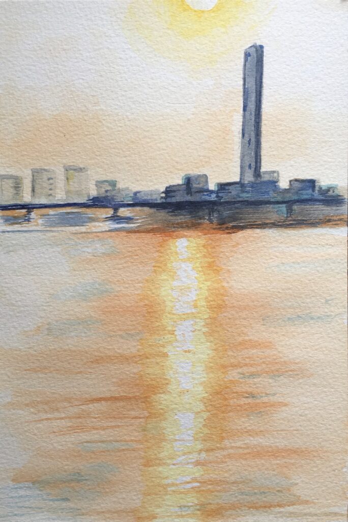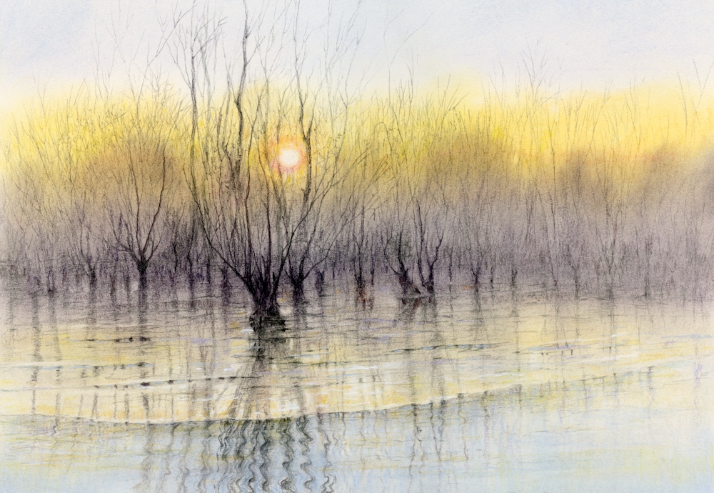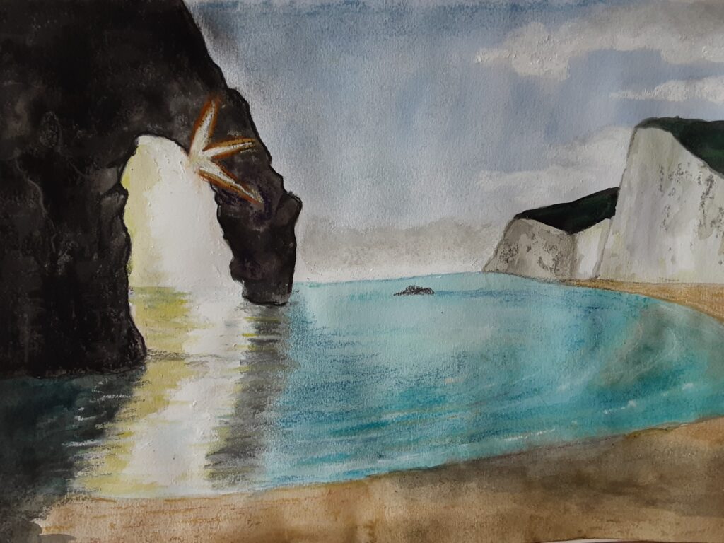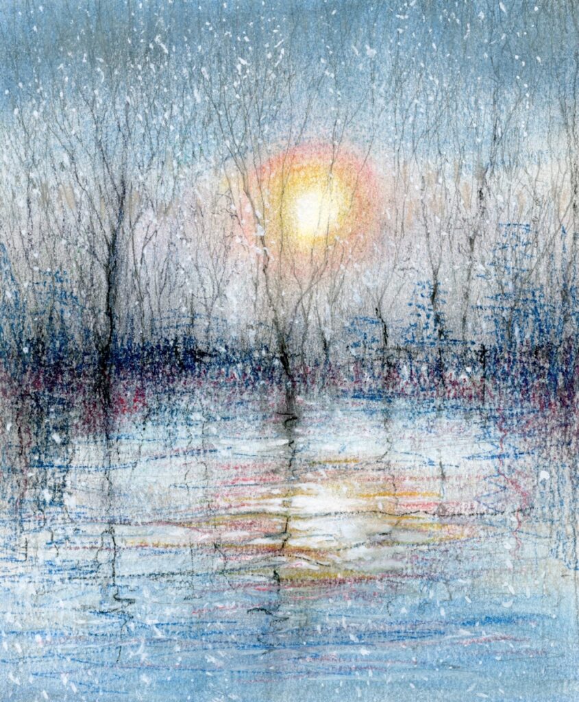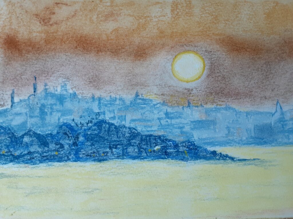2. Using pastel or watercolour or a watercolour/pastel combination make a painting where the sun is evident in the sky and may also include a reflection of the sun. The reflection may appear as the reflection of the whole sun or as a sparkle on the water.