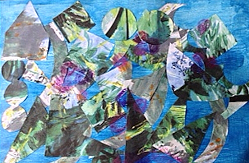 The pieces could also of course be dropped on the support and glued where they fell. If a collage was not required it would be easy to make a series of photographs of several dropping events with pieces from the same art work. The resulting photographs might suggest an interesting painting or be art works in their own right separately or collectively. Old greetings cards, magazine pages etc. could be similarly recycled.