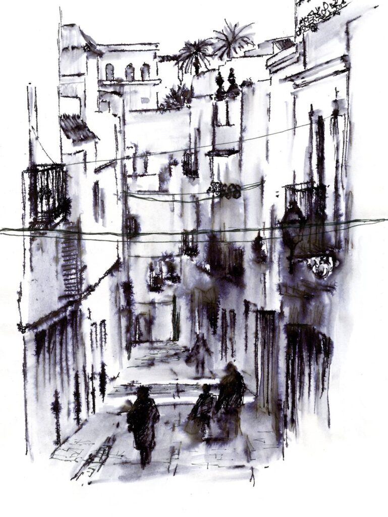 Tone: look at the dark areas. If a shop has an awning, what is below may be very shadowed. Doorways are often in slight alcoves and relatively dark. Really look at the pattern of light and dark across your reference sketch or photo. There may also be significant cast shadows. Contrasts of tone will be much greater on sunny days while cloudy days result in rather flat lighting so communicating this will give your work the atmosphere of the day, as well as depicting the objects.