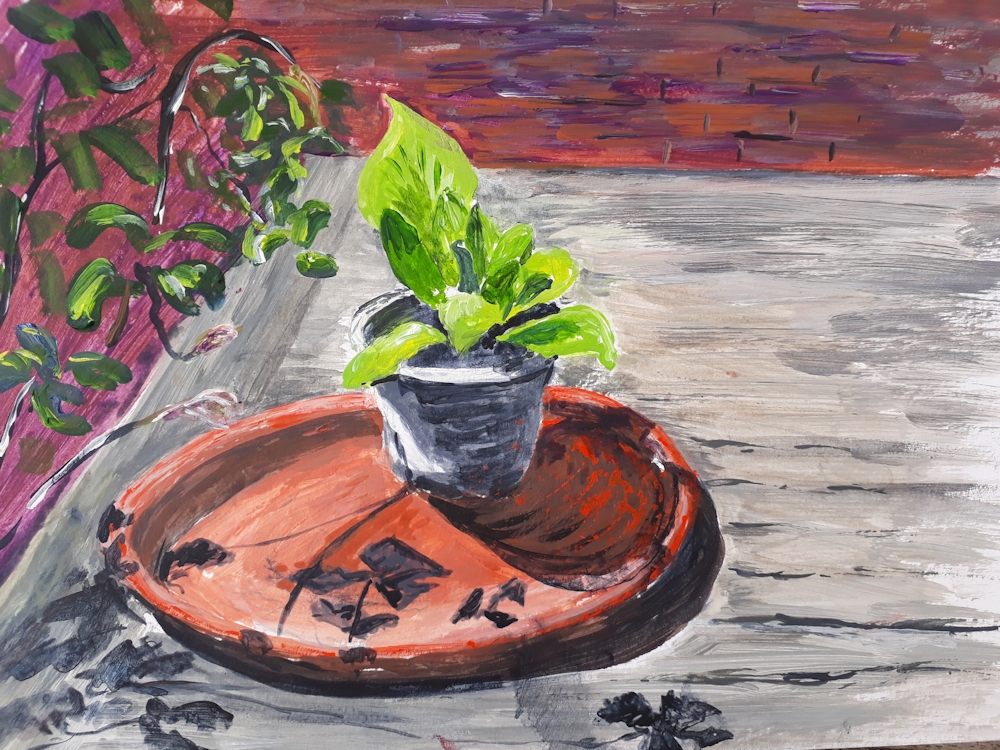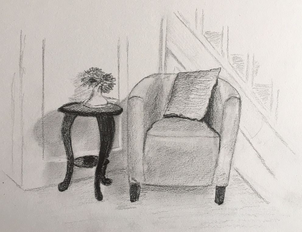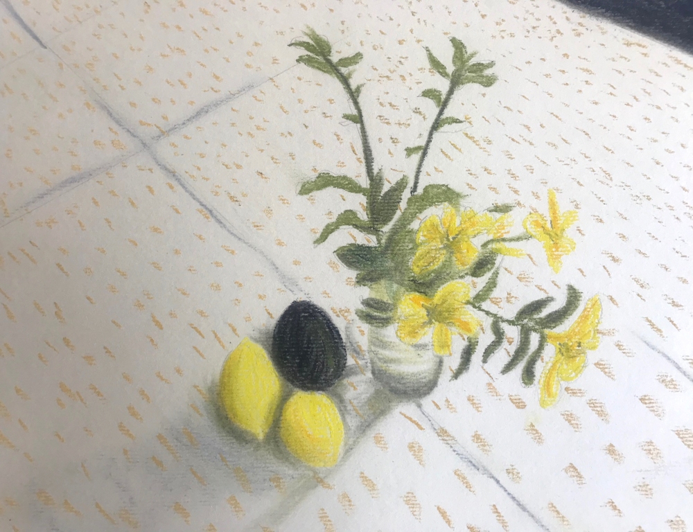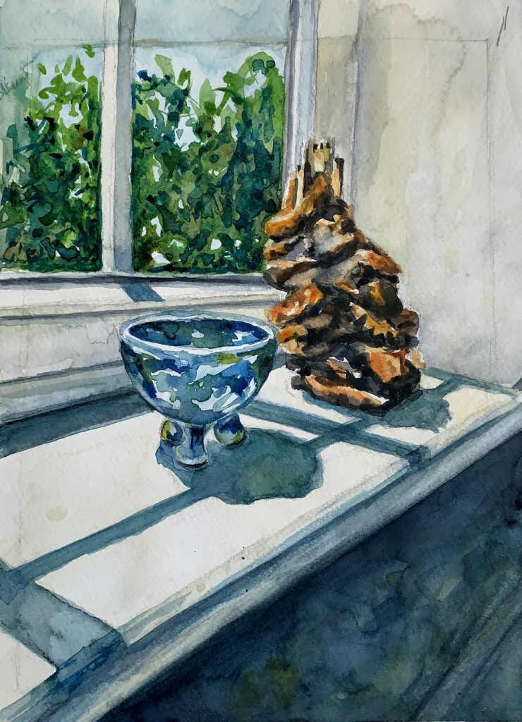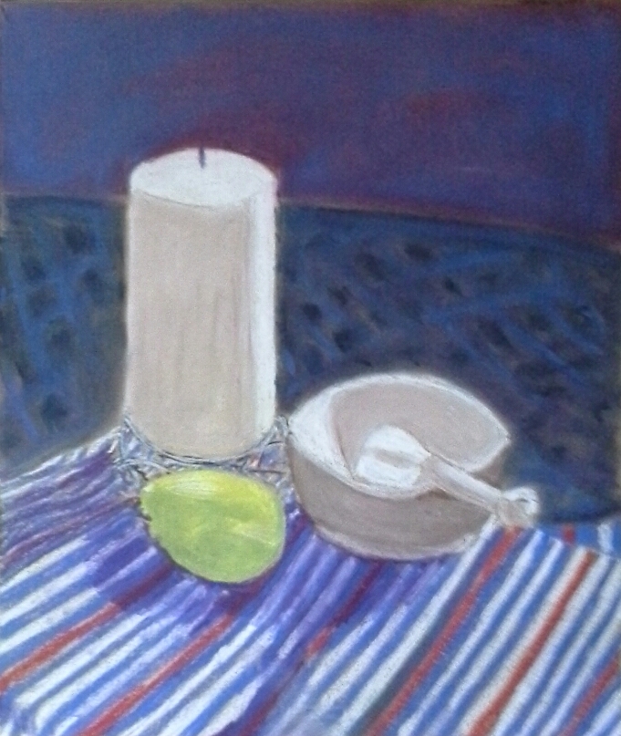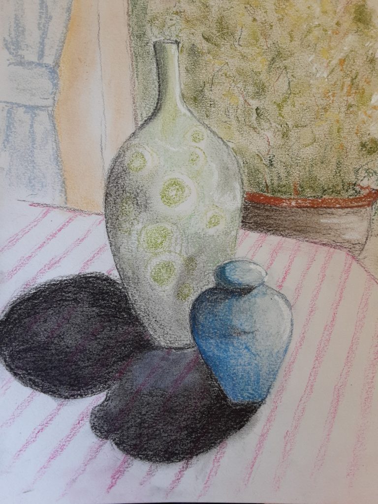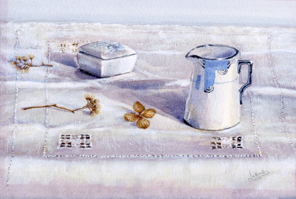 Vivienne has made an exciting composition with tone, using light against darker areas effectively. The curve of the table, shape of the jug and diagonal with the two tiles in subtle blues at the upper right, gives this painting a strong abstract framework.