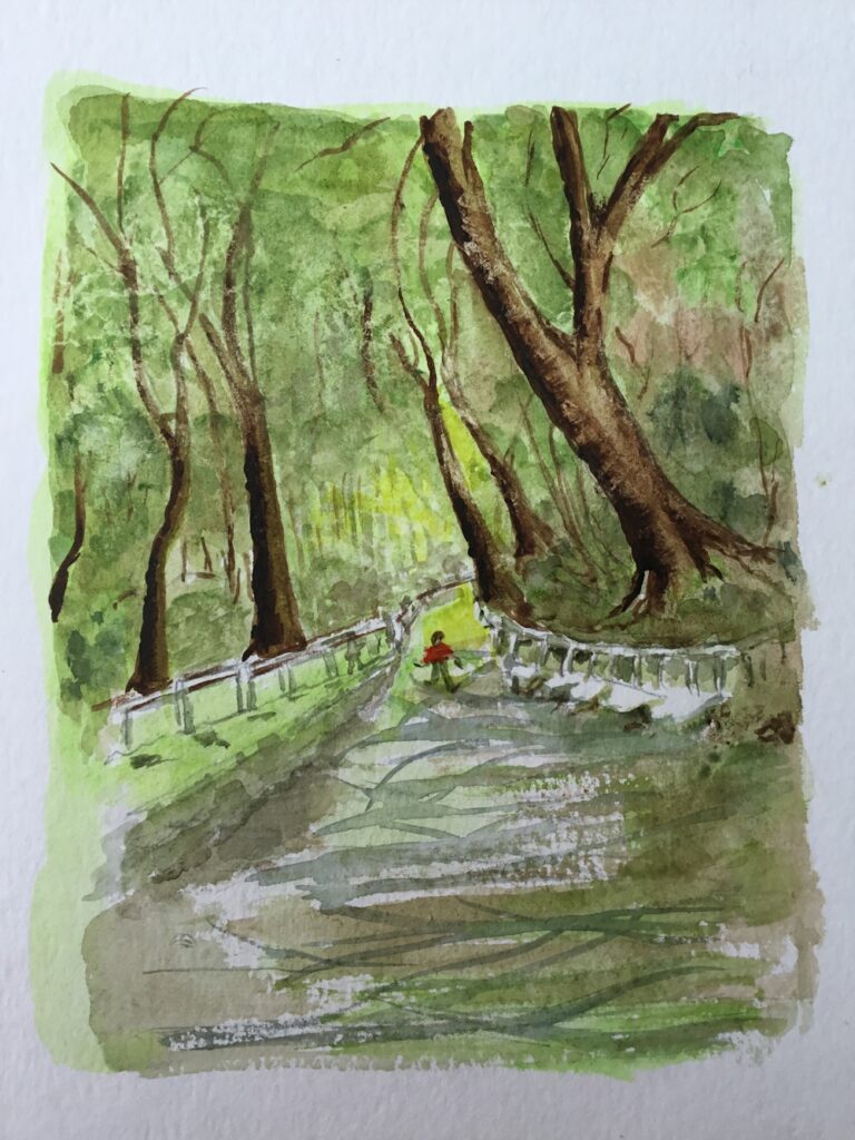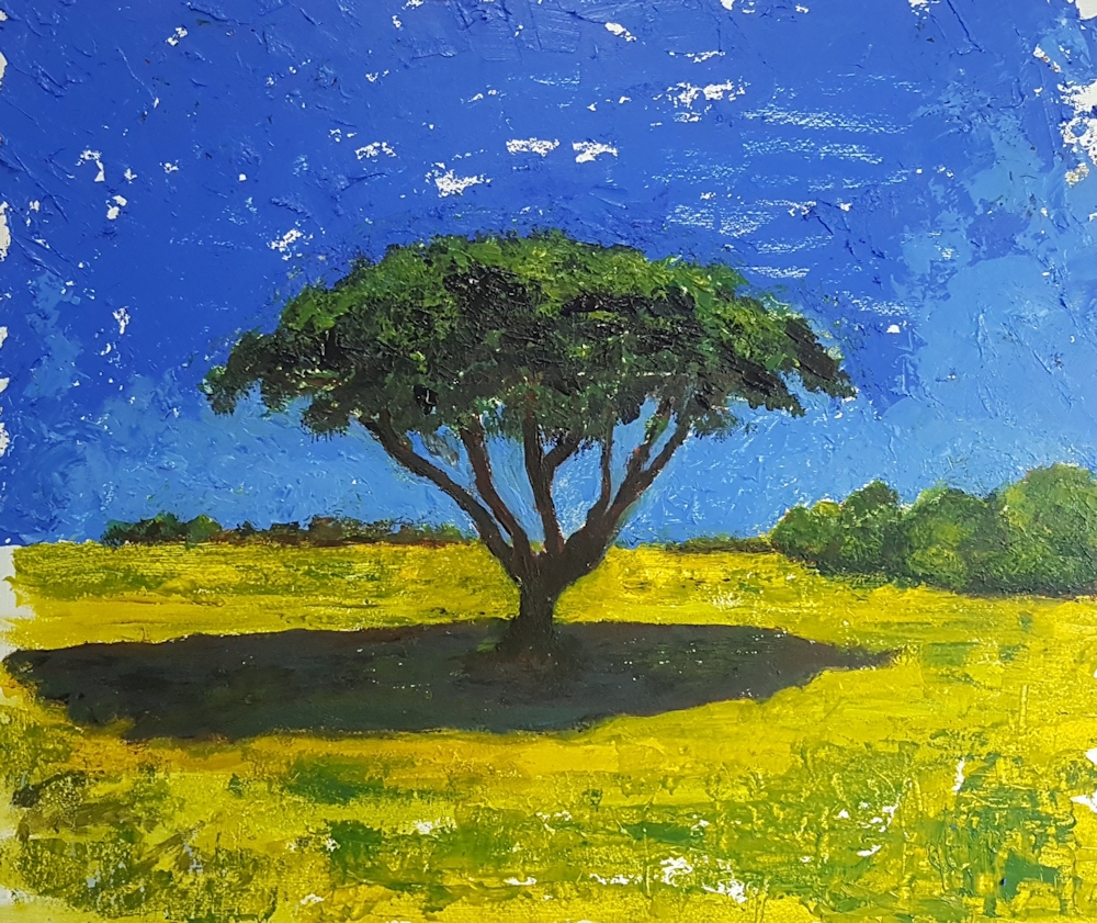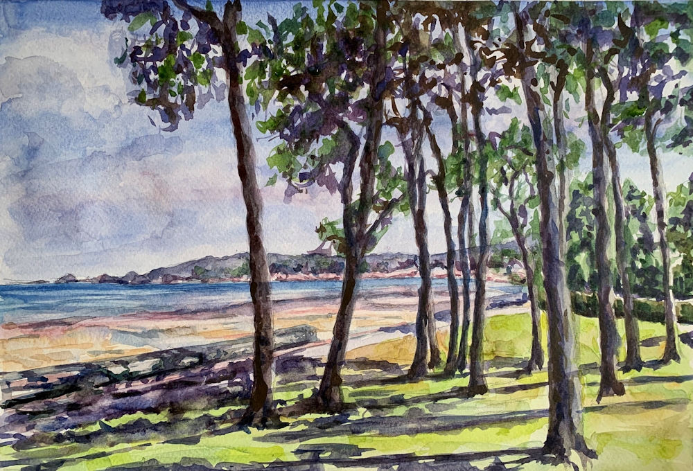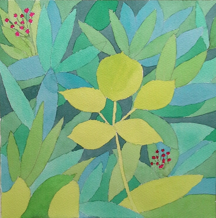 There is a fine balance between getting the essential character of the tree by getting the angles of the main trunks and branches right and the challenge of overlaying it with blossom and leaves in a way that does not appear overly detailed or fussy, but does give an idea of the tree’s character. If the blossom is all the same tone it can appear quite flat so look at where the light is coming from and observe the shadow areas well.