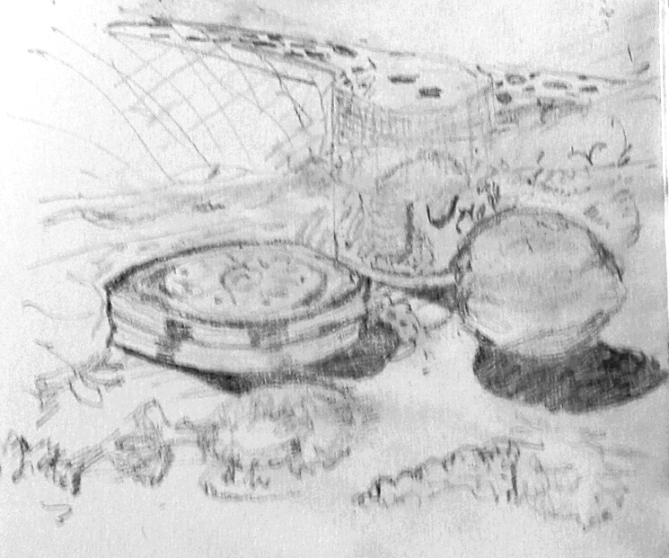 Washes of dilute ink, watercolour or “dry” washes of pastel add tone and atmosphere, and all the little marks can add further descriptions of the main players and introduce smaller ones. These little marks may suggest the ageing process whether in a face or a piece of driftwood. Shells and stones carry the marks of their history, growth lines or pits made by burrowing worms etc. Likewise the barks of trees can bear growth marks, further enriched by the growth of lichens.and fungi; the minor characters.