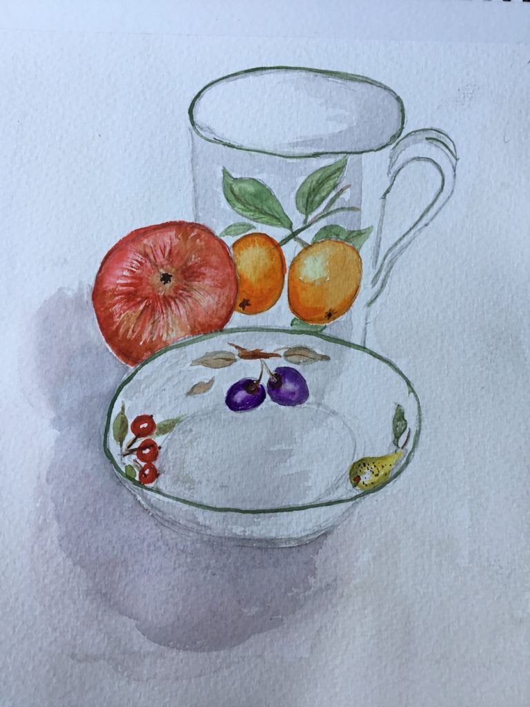 Think about the background. I chose to invent a wet in wet background . You can do the same or choose to have a patterned cloth, or for the backdrop to take in part of the room. Always look carefully at the tones and how they relate to the cup and saucer. Look for shadows; the shadow that may be cast on to the saucer by the cup and the shadow below and/or to one side of the cup and saucer that falls on to the cloth or a wall behind.