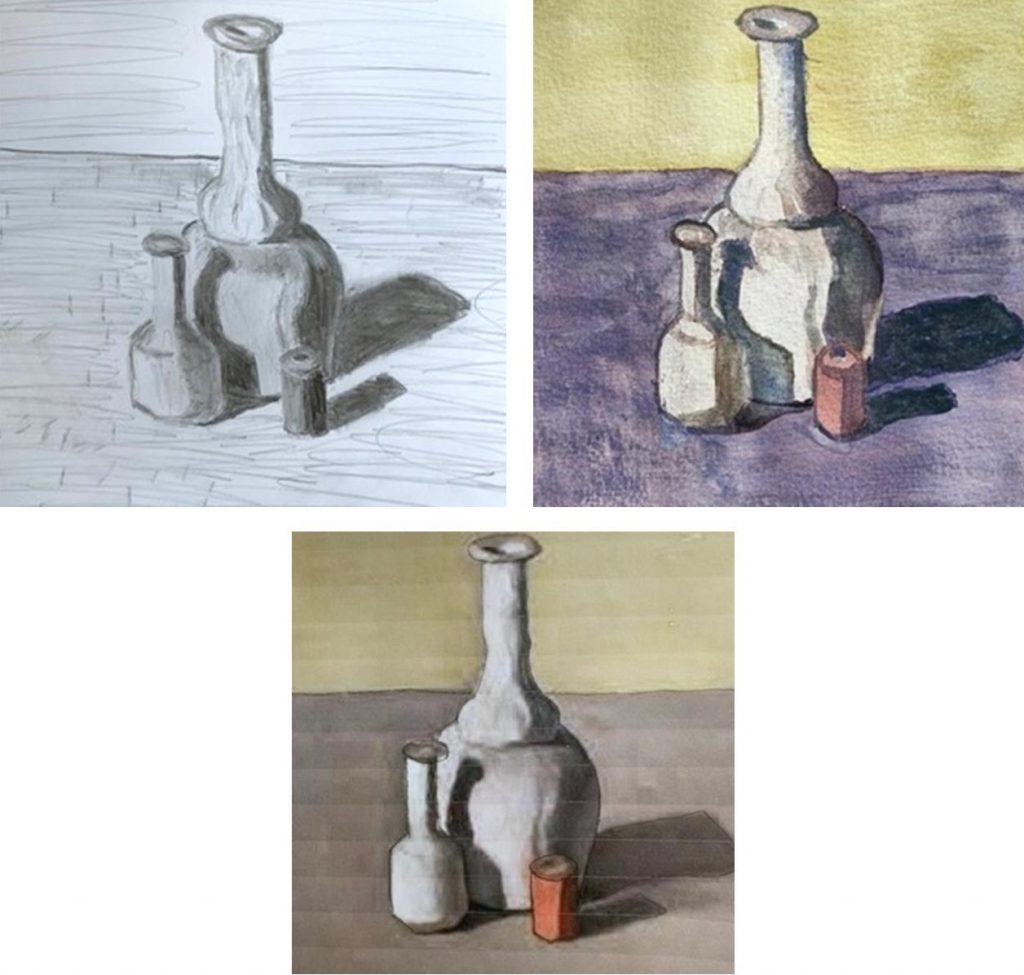 3b. Make two similar under paintings in greyscale for a simple composition, then glaze with colour to produce a subtle version and a more vibrant one. Take care with the tones in your under painting. Think about the fact that every time you add a layer of transparent paint that area will become darker. Make sure you paint some white areas for the palest glazes and any areas that will remain white. However, with acrylic if you haven’t got the tones quite right you can always repaint with white or the right shade of grey and add more glazes.