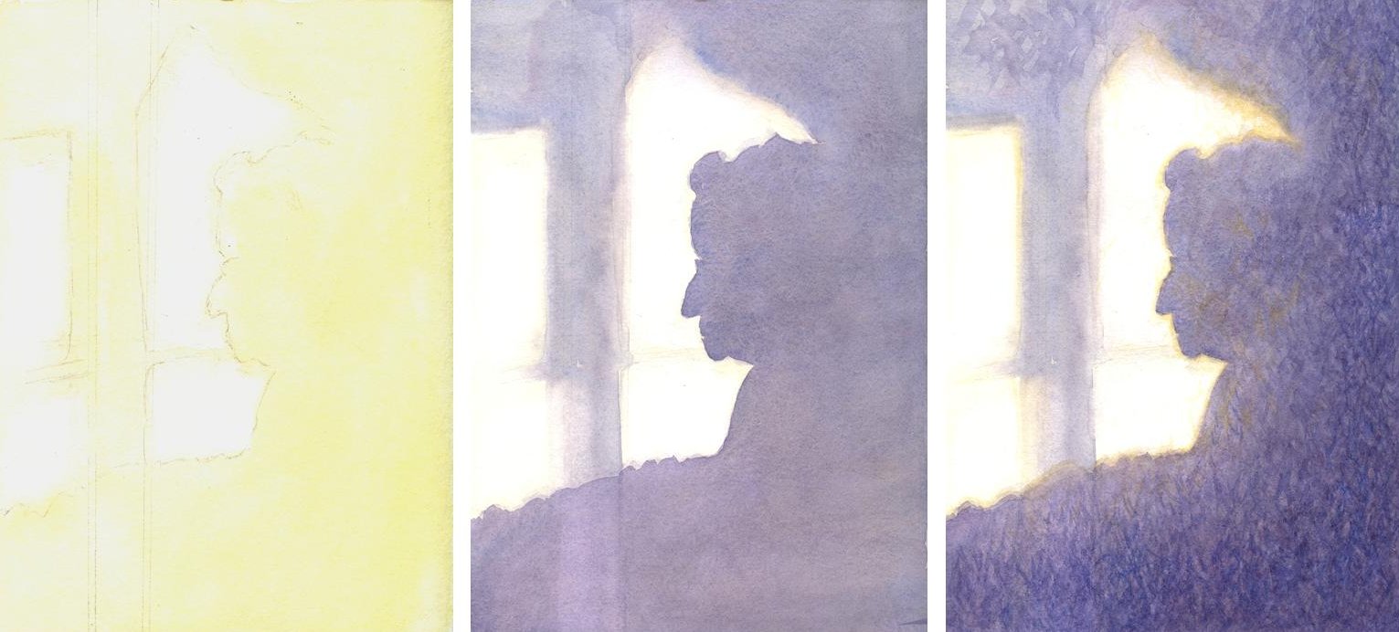 Moisten the whole square with a sponge and paint the shadow while the paper is still wet.