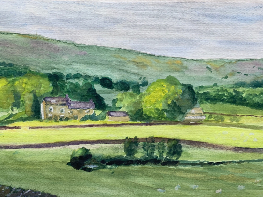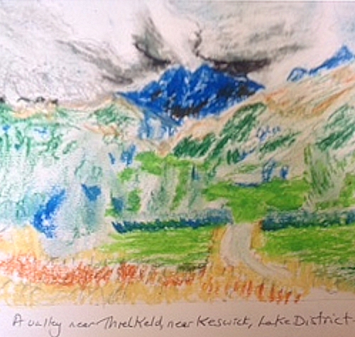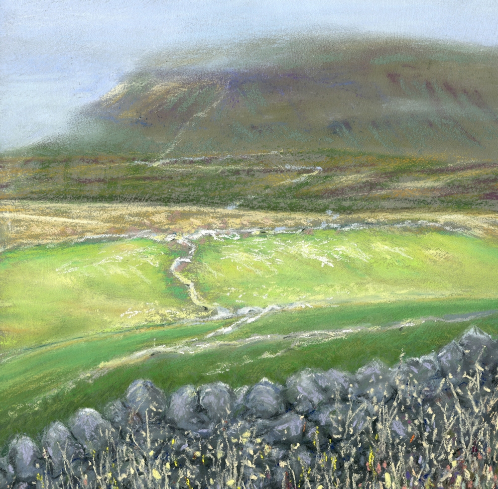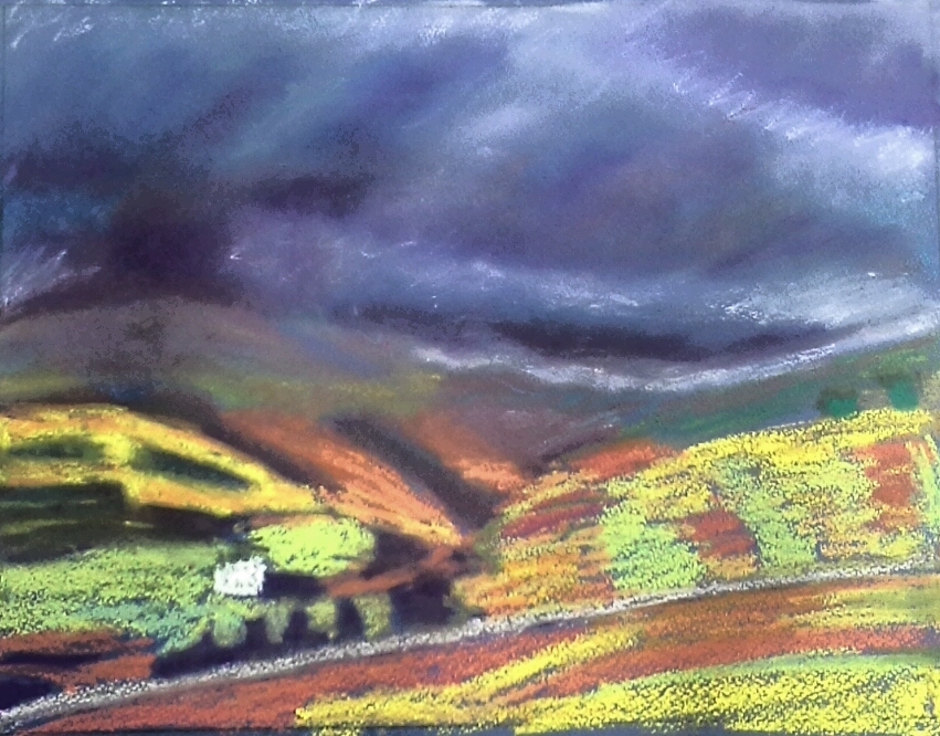 Except for the pastel painting above the illustrations are photographs taken in Yorkshire, where the hills are such that cloud shapes can often be seen as shadows on the hills or gaps in the cloud cover bringing patches of extreme brightness to the landscape. There are also more subtle cloud shaded areas where the clouds are not visible as whole shapes with clearly defined edges, but their shadows make their presence visible as dark grounds in the distant, middle or foregrounds.