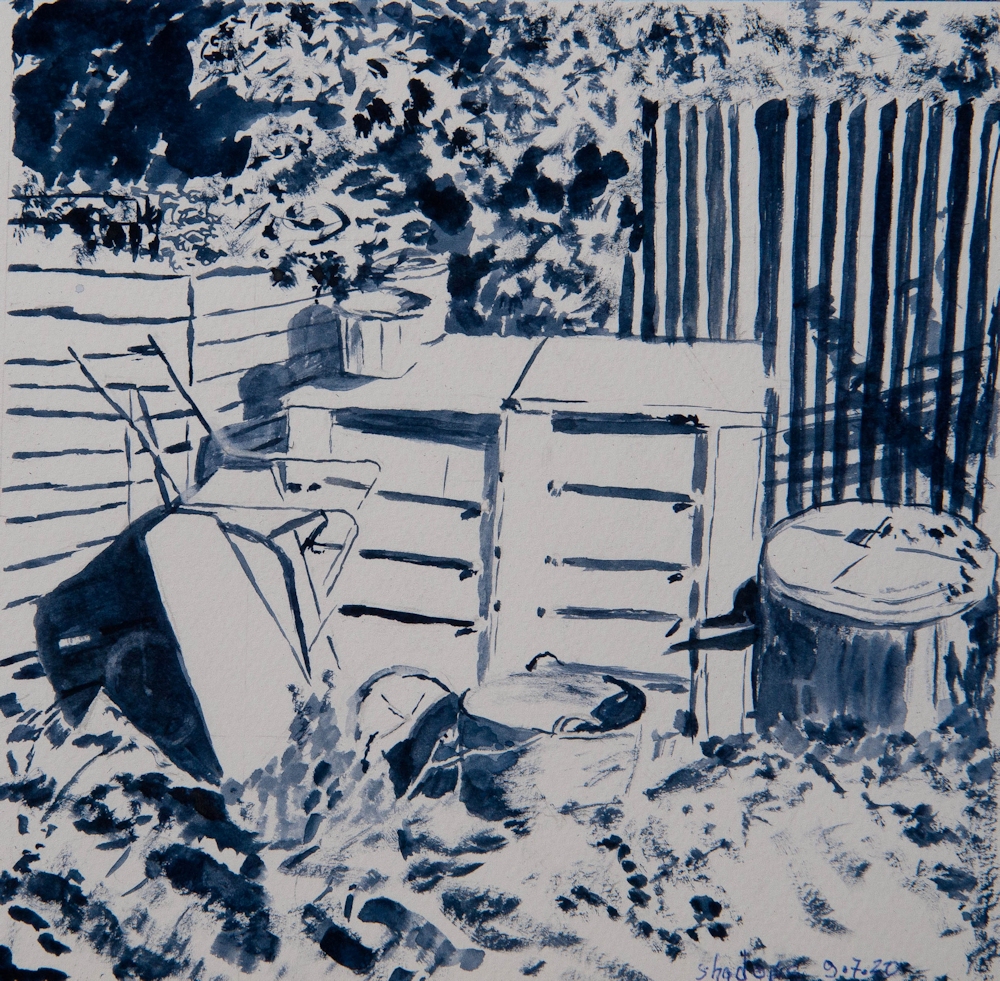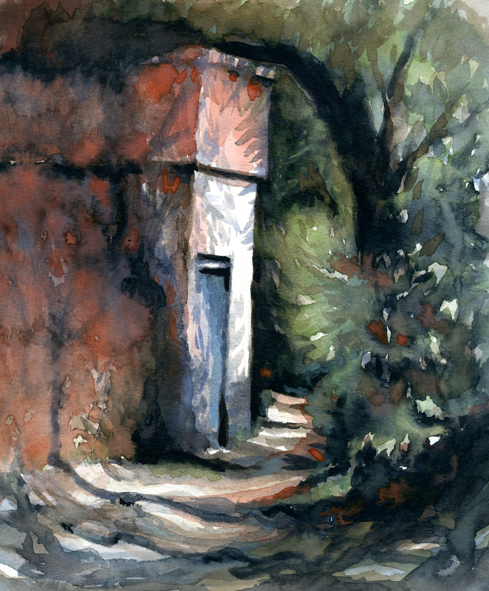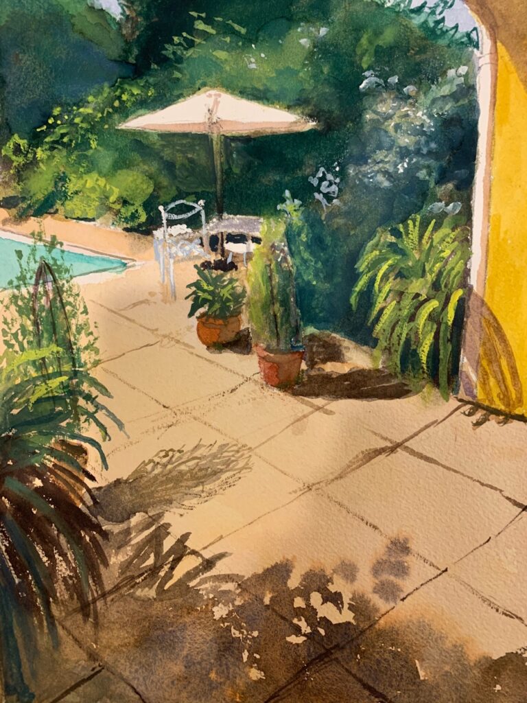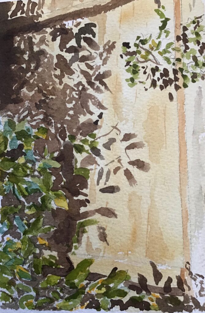 One of the most beautiful examples of soft and harder shadows in watercolour is a work called “Corfu: Lights and Shadows” painted in 1909 by John Singer Sargent and a great mix of watercolour applied both wet in wet and wet on dry. If you have a wall on which a tree or shrub casts its shadow try and use similar techniques.