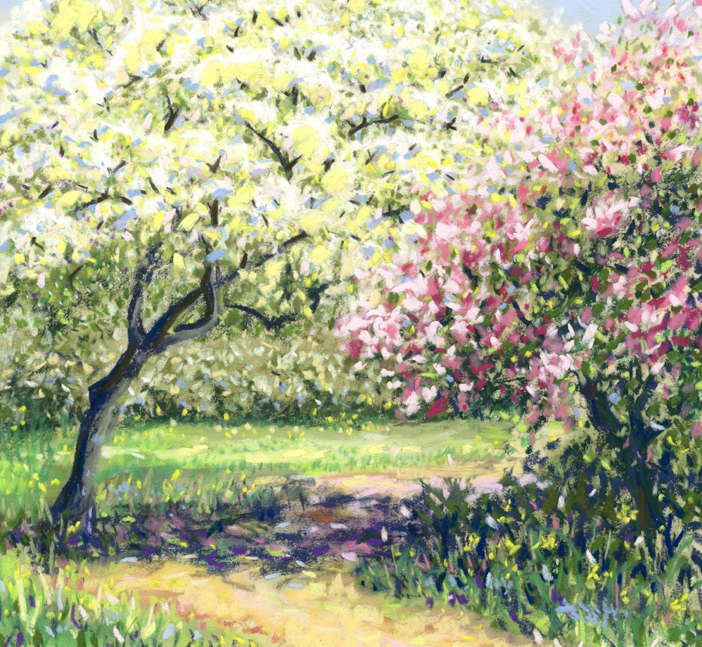 A complex branching system can be daunting but as you can see from the finished work at the beginning of this post it can be reduced to little dots and dashes of pastel. I hope to finish the ‘Apple Tree in progress’ tomorrow or Wednesday and will insert the final stage sometime this week.