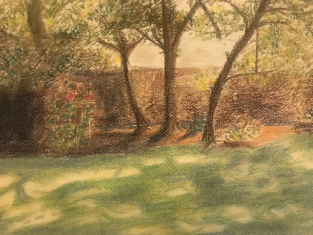 What we will look at in some detail is the difference between soft and hard shadows and ways to depict them. The first reference artist I have chosen is Renoir, in particular two paintings. The first is “ Women in a Garden” about 1876, where a garden path with bright flowers on the left leads to two figures, one with a white parasol. The foreground is taken up with the dappled shadows of a tree we cannot see and on one side of the path is the cast shadow from a paling fence on the right. Note the deeper tones of the shadows nearer to the viewer and the paler more blue shadow cast by the fence as it follows the path in the middle distance. The foreground shadow has hints of the flower colours in the broken colour technique used and this could easily be emulated in pastel. If you have a similarly shaded path it would make an excellent project for this week’s challenge.