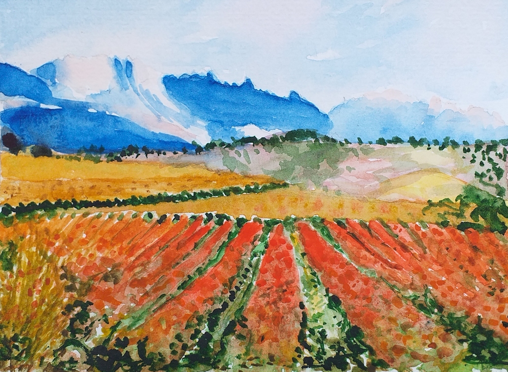 Shady Lane on the Edge of Oumesnat, Morocco: watercolour by Jo: Note wet in wet and wet on dry technique in shadow areas.