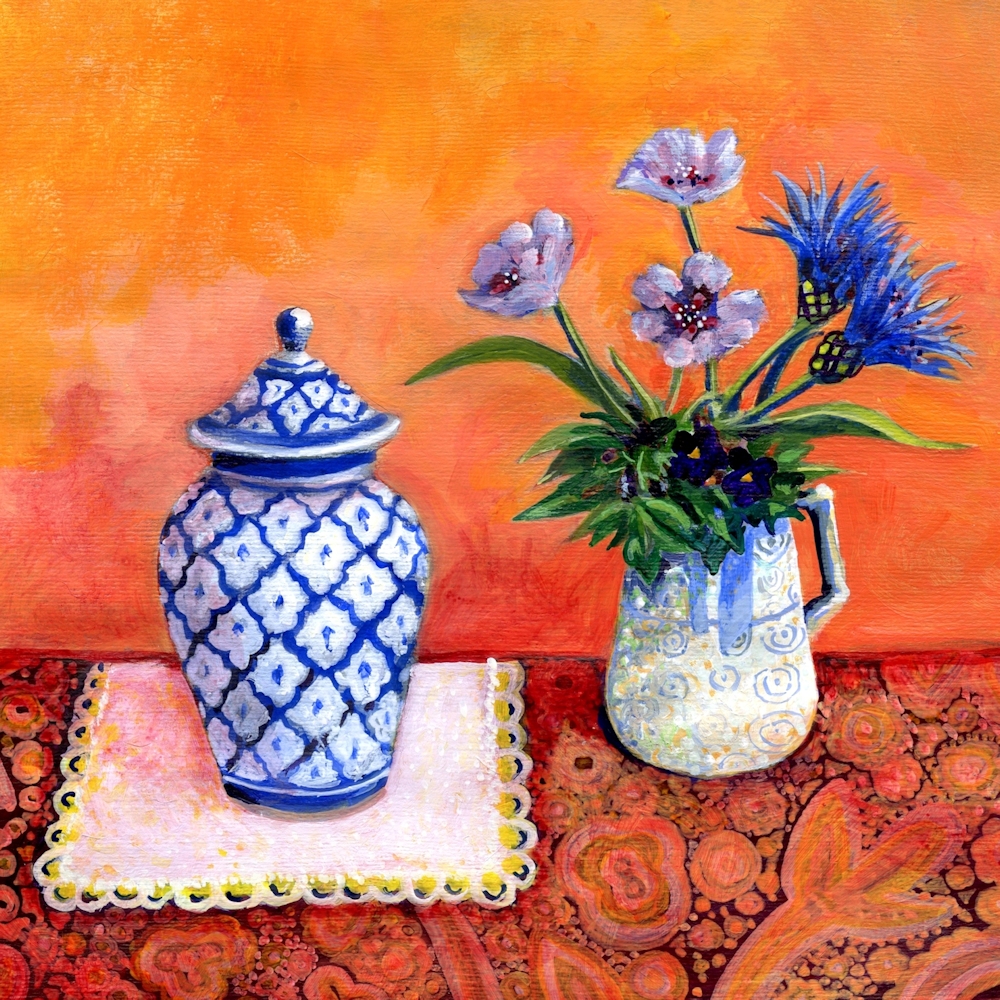 In this workshop we will be inspired by the colourful still lives of Bernard Cathelin and Sue Fitzgerald, painting in acrylic and perhaps adding a collage element. Fitzgerald’s work reflects her travels round the world and you are very welcome to include collected objects in your painting. To view Cathelin and Fitzgerald’s work either Google their names or visit Jo’s still Life Pinterest Board at