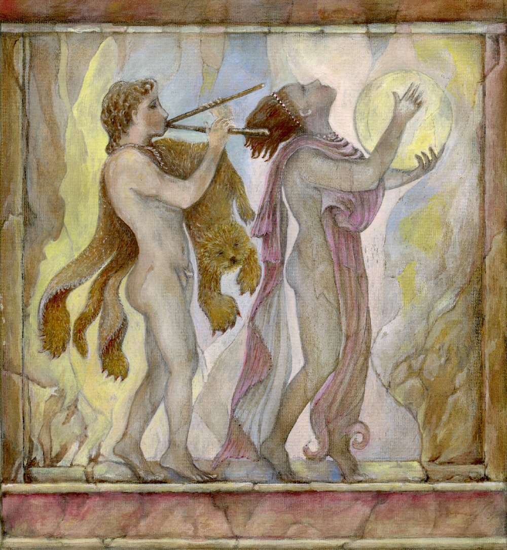 Part of a marble relief of a Bacchanalian procession in the British Museum realised in colour.